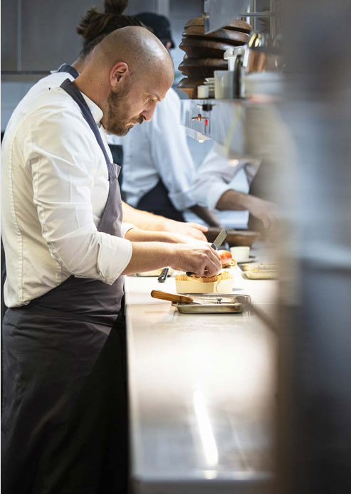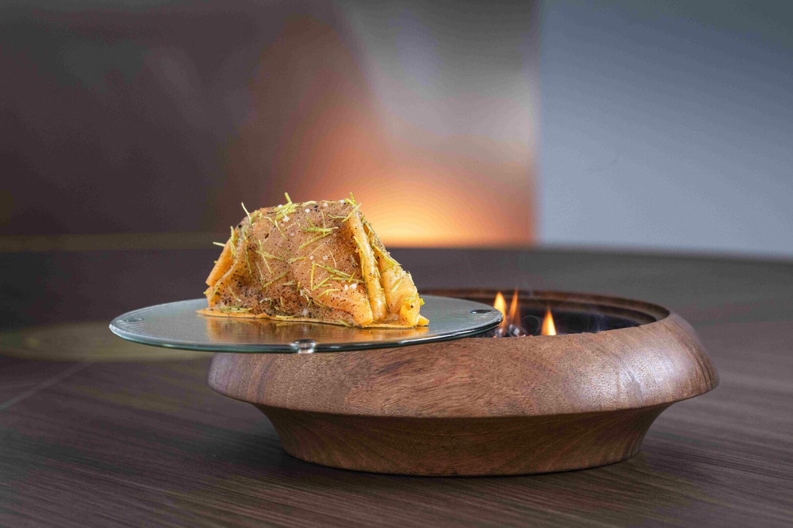 La cuisine de Thomas Prod’Homme se veut réconfortante, parfois même régressive, mais toujours d’une grande rigueur. Il travaille la concentration des goûts dans une même bouchée plutôt que la démonstration, cultive l’acidité avec finesse grâce aux acides lactiques de laitages d’exception sourcés à la Ferme du Pralong, et s’appuie sur les ressources naturelles de l’altitude : bourgeon de sapin, mélilot, berce… Chaque plat raconte une mémoire. Trois menus, dont un végétarien, dessinent une vision moderne et sensible du dîner en montagne.