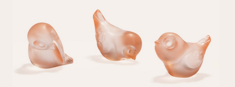 Piou-Piou : Trois petits oiseaux de cristal viennent compléter le bestiaire Lalique avec une douceur extrême. L’un lisse ses plumes d’un geste élégant, l’autre picore l’instant, tandis que le dernier, tête levée vers le ciel, semble écouter le chant du vent. Des oiseaux enchanteurs figés incarnant la chorégraphie de la nature, figée dans la lumière. En cristal incolore pur ou patiné d’un tendre corail, ce trio malicieux incarne des instants de douceur cristallisés et l’âme de la collection Air de Lalique.