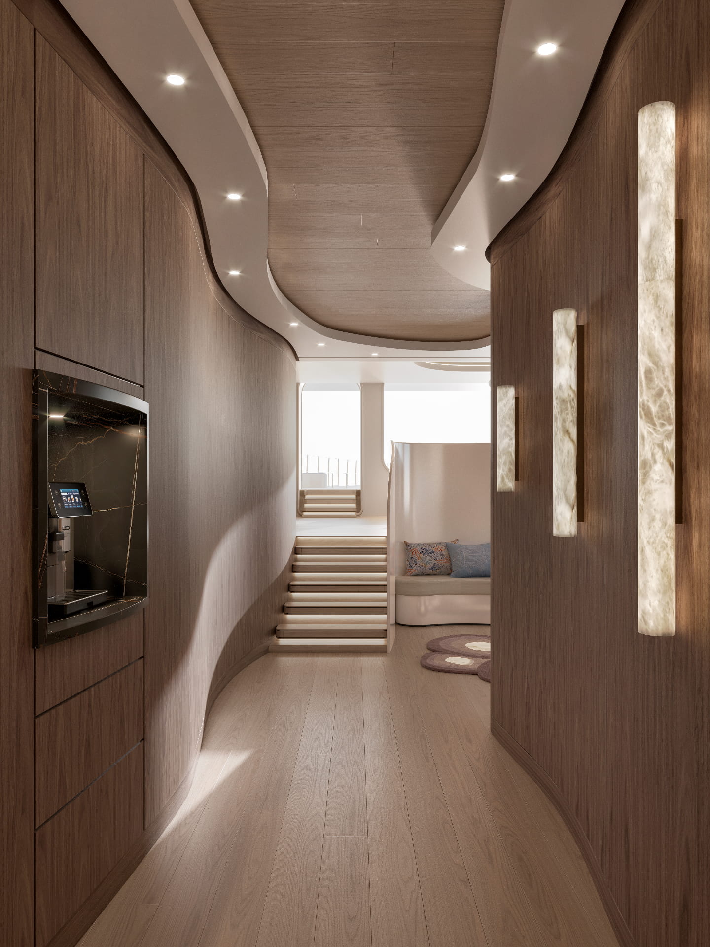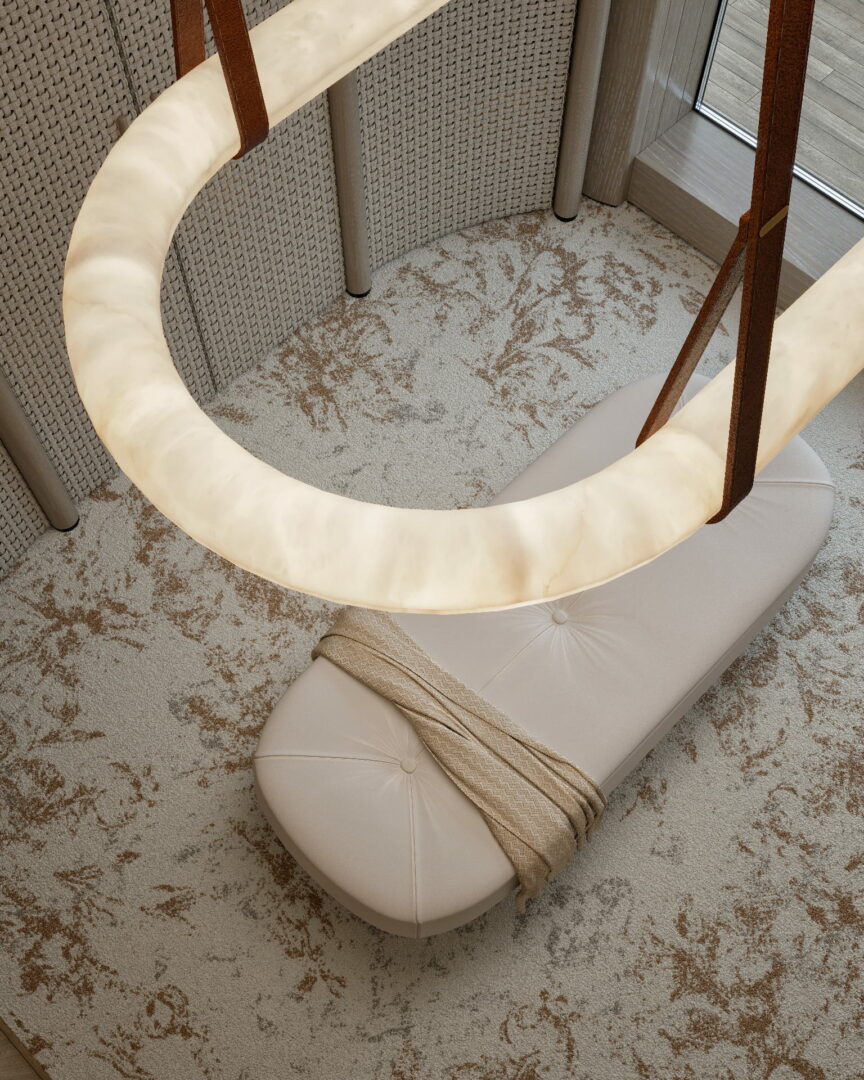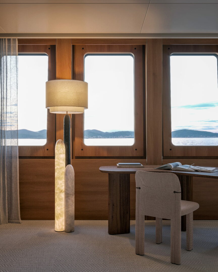 Les pièces en albâtre, habilement intégrées dans les designs des yachts, ne sont pas simplement des objets décoratifs. Elles deviennent une extension de l’espace lui-même, dessinant des atmosphères sublimes et jouant avec la lumière naturelle et artificielle. Une présence architecturale qui se fait ressentir sans jamais dominer, sublimant chaque recoin du yacht, du salon à la cabine, du pont à la salle à manger.