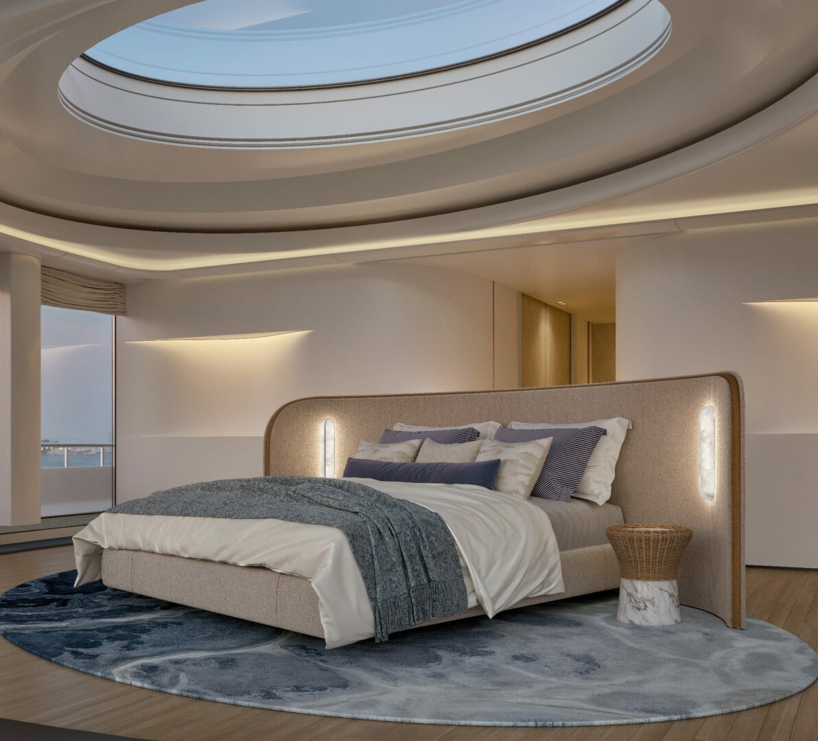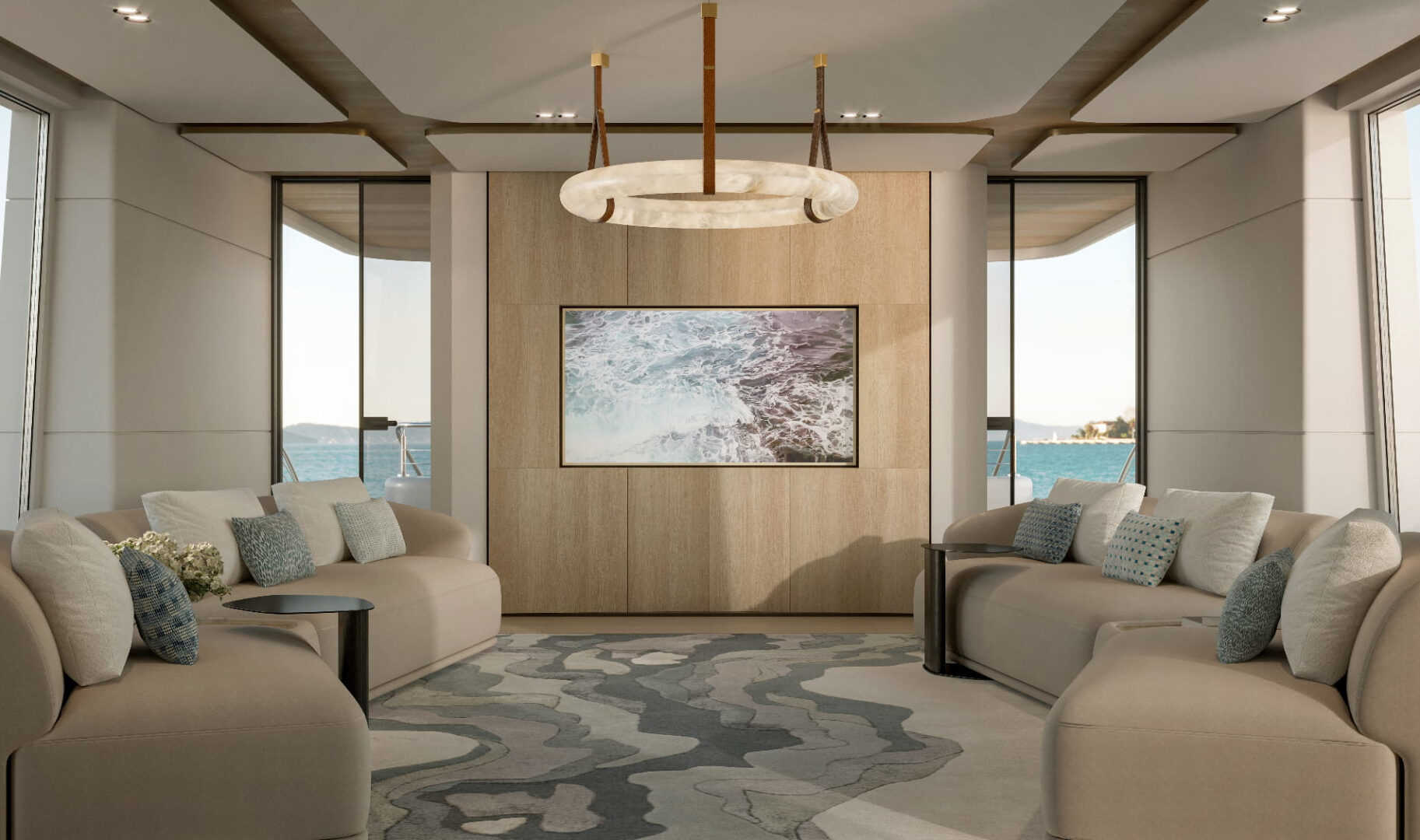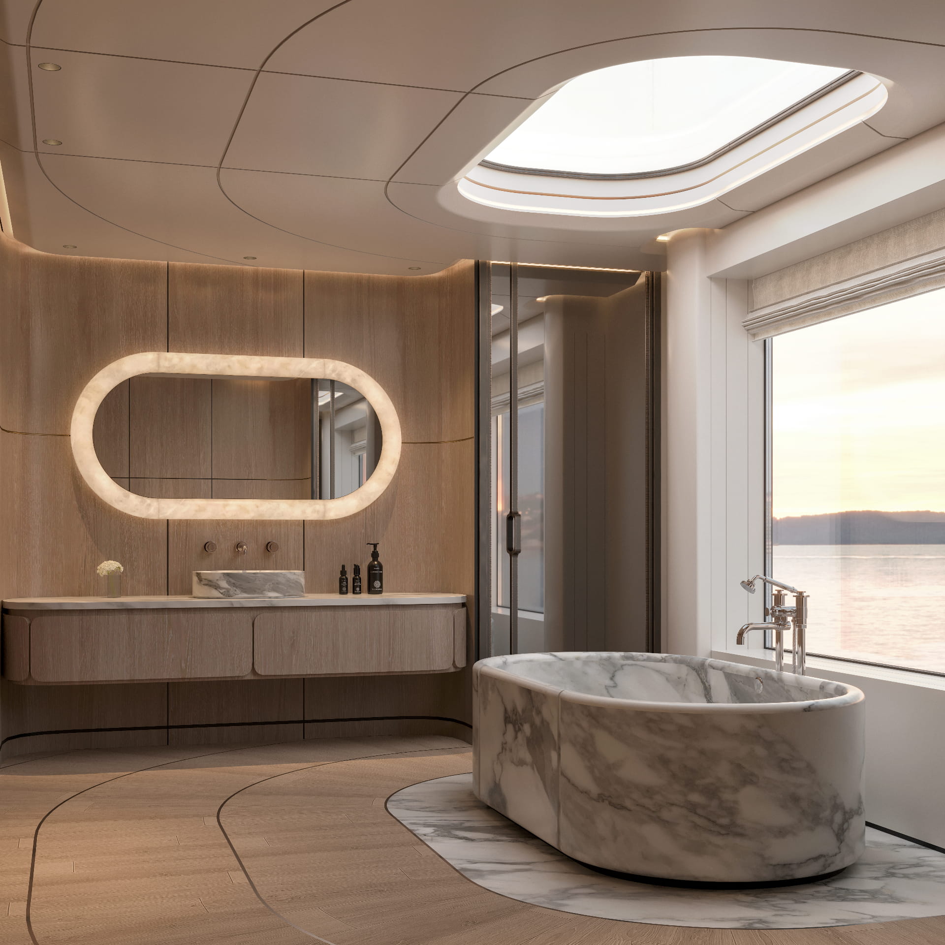 Les pièces en albâtre, habilement intégrées dans les designs des yachts, ne sont pas simplement des objets décoratifs. Elles deviennent une extension de l’espace lui-même, dessinant des atmosphères sublimes et jouant avec la lumière naturelle et artificielle. Une présence architecturale qui se fait ressentir sans jamais dominer, sublimant chaque recoin du yacht, du salon à la cabine, du pont à la salle à manger.