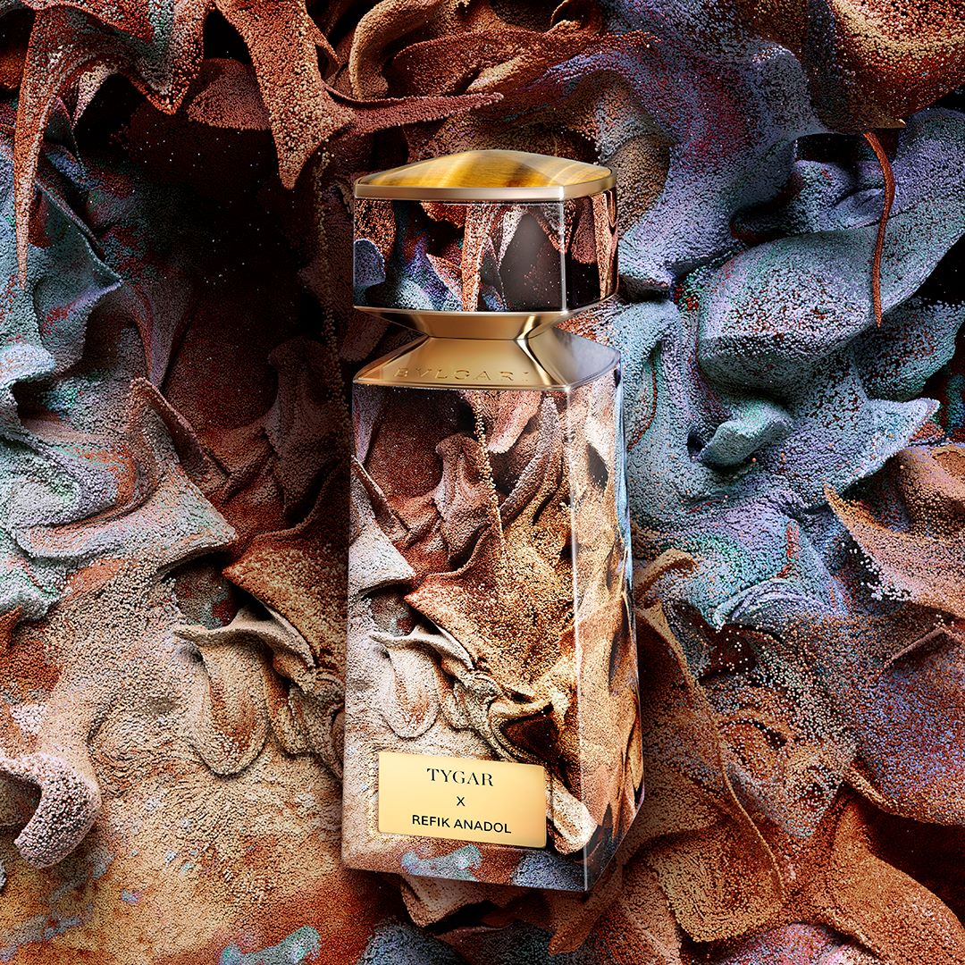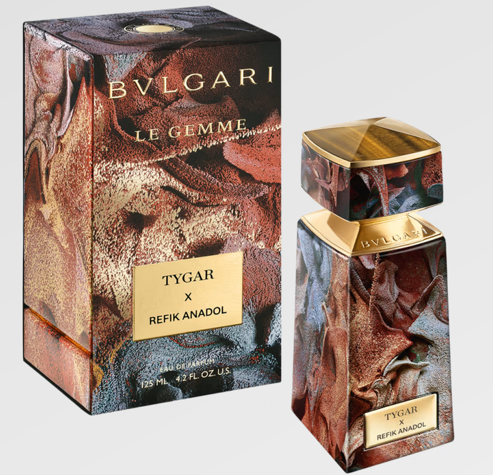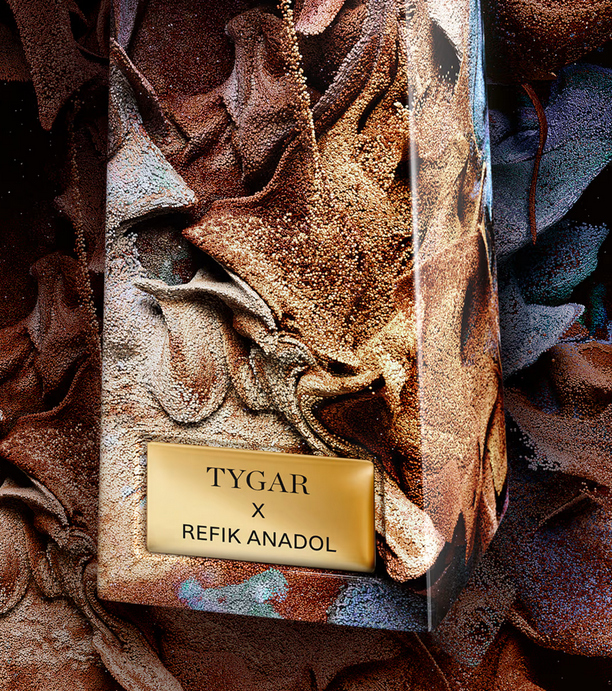 Refik Anadol, pionnier de l’art par intelligence artificielle, a créé une œuvre unique, Le Gemme Tygar x Refik Anadol, qui habille le flacon, l’étui et le coffret, donnant une forme visible à l’invisible : la fragrance. L’artiste traduit ses contrastes vifs d’agrumes et boisés dans un paysage numérique fluide, où l’héritage, l’innovation et le savoir-faire convergent dans un moment immersif de poésie visionnaire.