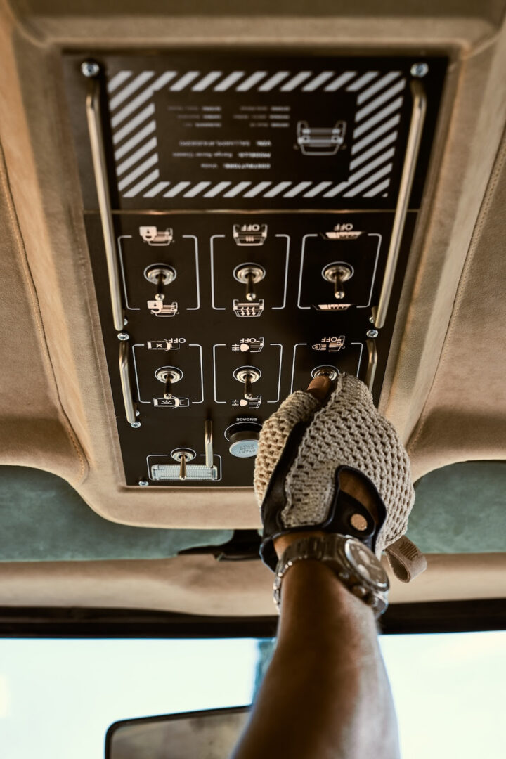 Un encodeur tactile en aluminium moleté, placé sur le tunnel central, commande les fonctions embarquées, y compris l’éclairage d’ambiance. La console de toit, inspirée de celle d’un jet d’affaires, accueille des commandes de style aéronautique offrant un ressenti tactile unique.
