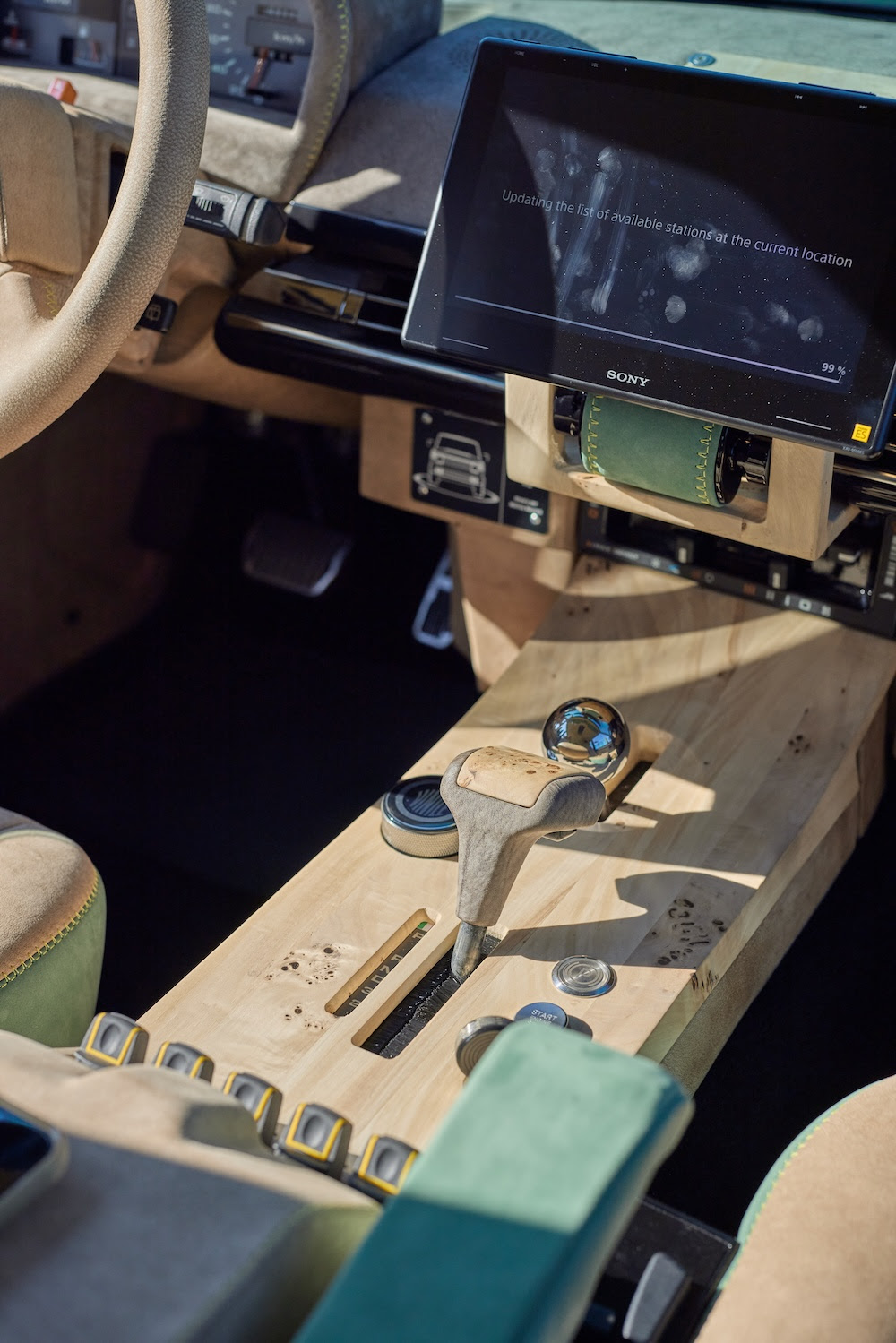 La réalisation mobilise quarante-cinq mètres carrés de cuir dans les nuances Bo.Hemian Choco, Bo.Hemian Savana et Kashmir Menthe, associés à de la ronce de peuplier blanc massif, sculptée dans un seul bloc et utilisée pour les habillages de portes, le tunnel central et le support du tableau de bord.