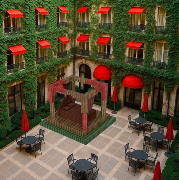 Installée du 20 septembre au 11 novembre 2025, l’œuvre transforme la cour Jardin du Plaza Athénée en un espace de contemplation suspendu dans le temps. Inspirée par l’architecture et les couleurs emblématiques du palace – un subtil jeu entre rouges profonds et verts apaisants – l’installation évoque à la fois le confort d’une chambre rêvée et la puissance évocatrice d’une œuvre d’art.