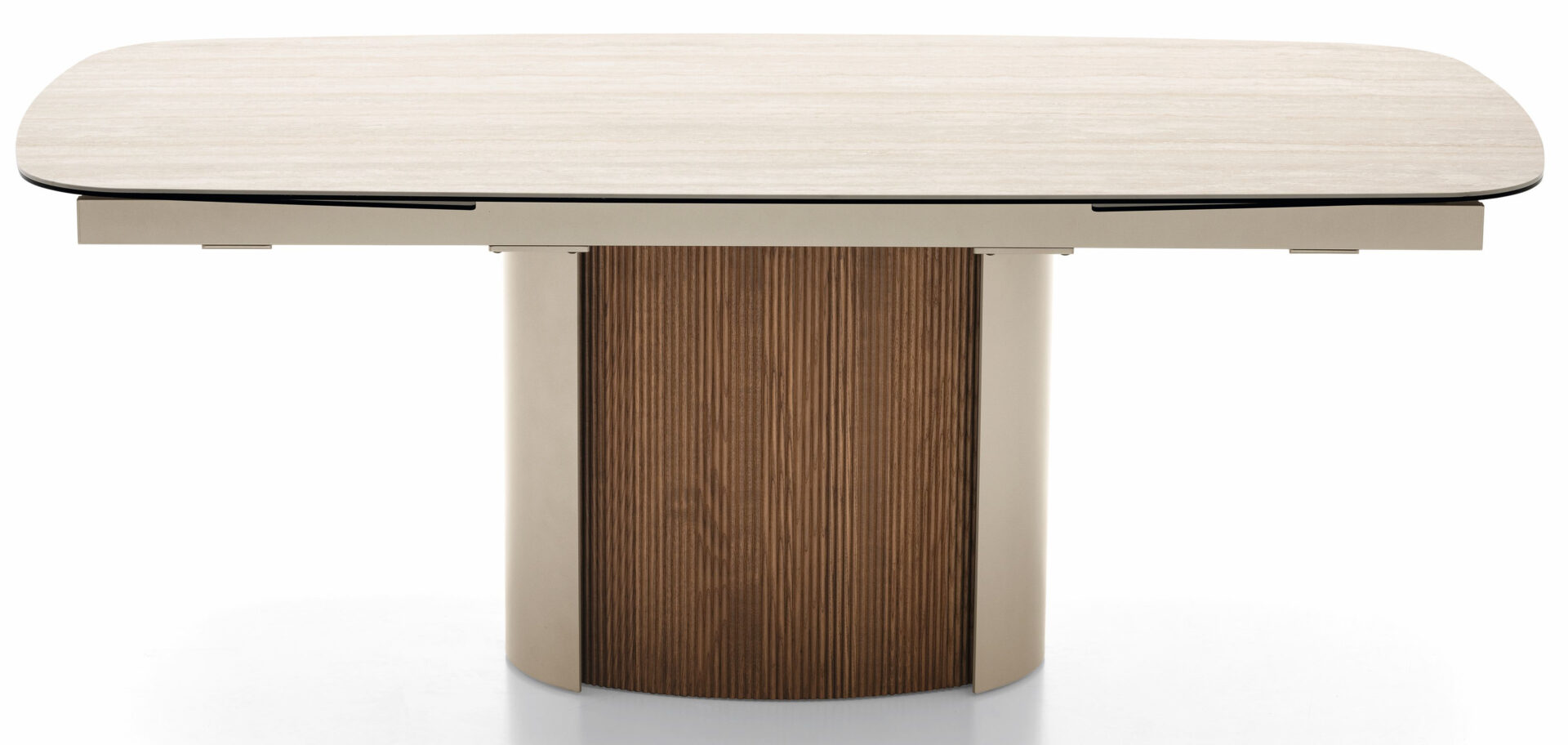plusieurs finitions, inserts en plaqué bois ou effet canneté noir mat ou noyer, composée de deux éléments en tôle courbée assortis au caisson et de deux éléments en bois façonné, avec plateau bois ou céramique – Différentes dimensions et formes disponibles – Crédits photos ©Calligaris