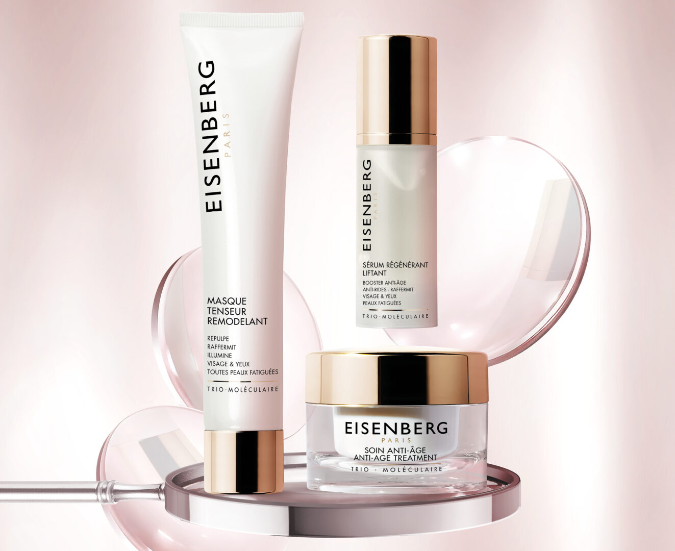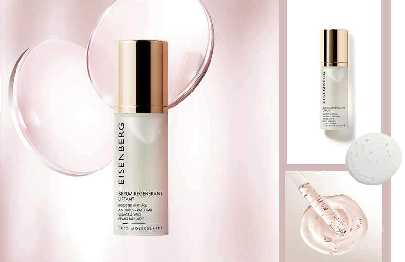 La marque de luxe française Eisenberg Paris présente trois soins pour trois actions complémentaires contre les signes du vieillissement : réduction des rides, raffermissement et hydratation intense : Masque tenseur remodelant, Sérum régénérant liftant, Soin anti-âge.