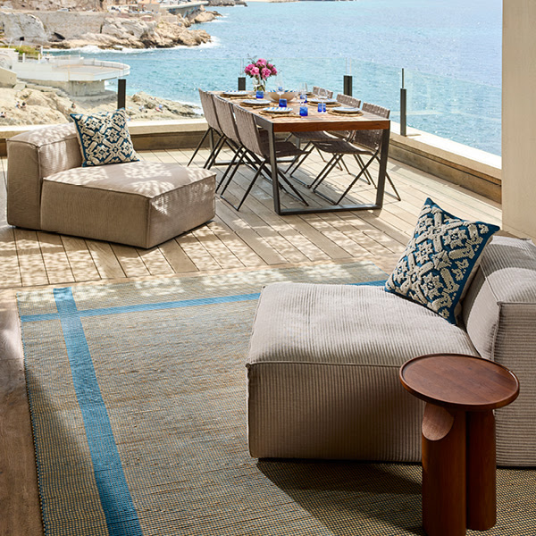 De gauche à droite : Tissu circulaire outdoor Cabannes Pebble – Archives Designers Guild – Sustyfabrics.com – Polyester – L. 137 cm / Tapis Salins – Collection Paysages – La Manufacture Cogolin – Tapis tissé à plat – Fabriqué à Cogolin en France – Raphia et coton – L. 222 x l. 312 cm