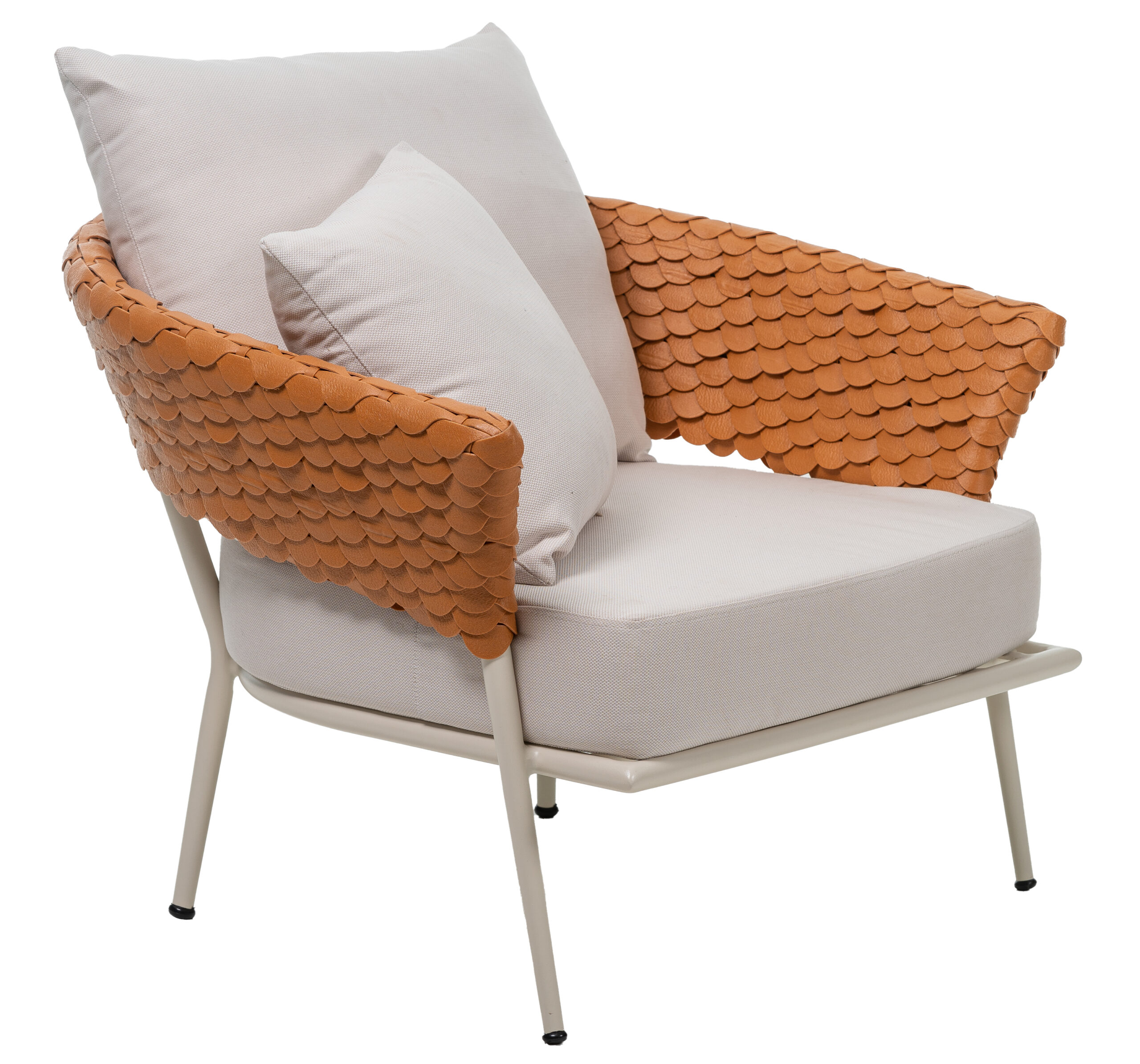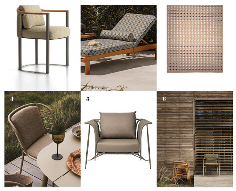 1. Chaise Moorea – Collection Open Air Moorea – design Carlo Colombo – Giorgetti – Structure en acier inoxydable AISI 216L – Assise et dossier en bois de teck massif, finition naturelle – Rembourrage en caoutchouc drainant à cellules ouvertes et trous de drainage pour son maintien au sec – Coussins déhoussables, tissus Open-Air au choix – L. 57 x L.59 x H. 71 cm – Prix sur demande / 2. Tissu circulaire Quartz – Archives Maison Antoine d’Albiousse – Sustyfabrics.com – 37% polyester et 28% viscose / 3. Tapis Fibra Grège – design Sarah Gracia – Serge Lesage – Tapis tissé à la main, pour l’extérieur et l’intérieur – 100% PET recyclé – PM : L. 250 x l. 350 – GM : L. 300 x l. 400 cm / 4. Chaise Cancún – design Morten Georgsen – BoConcept – Aluminium – L. 50 x H. 79,5 x P. 61 cm / 5. Fauteuil Ilhabela Beach – Rua Madeira – Aluminium, corde nautique et revêtement tissu – L. 96 x H. 80 x P. 83 cm / 6. Chaise E008 Embrace Outdoor – design Eoos – Carl Hansen & Søn – Teck certifié FSC™ non traité – Option coussin possible – L. 61 x H. 80 x P. 57,5 cm