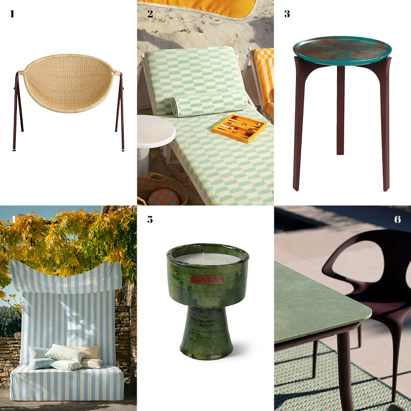 1. Fauteuil Flor Do Mandacaru – design Sérgio Matos – Rua Madeira – Aluminium, corde nautique et tissu – L. 129 x H. 112 x P. 99 cm / 2. Ensemble de jardin Terzo 2 places – Habitat – Tissu imperméable oléfine – Fauteuil : L. 70 x H. 80 x P. 95 cm / Pouf : L. 70 x H. 35 x P. 70 cm / 3. Drap de plage Transat – Anne de Solène – 100% coton, une face velours et une face bouclette – L. 180 x l. 100 cm / 4. Chaise BK10 – design Bodil Kjær – Carl Hansen & Søn – Teck certifié FSC™, non traité – Option coussin possible – L. 63,5 x H. 76 x P. 63 cm / 5. Bougie BAB Rose poudré senteur Figuier – Côté Bougie Marrakech x Fanny Lopez – Mèche 100% coton biologique, cire de soja et parfum réalisé à Grasse – XL : ⌀. 23 x H. 11 cm / 6. Collection BM Outdoor – design Børge Mogensen – Carl Hansen & Søn – Teck certifié FSC™, non traité – Table BM1771 : L. 194,5 x l. 78 cm – Banc BM1871 : L. 170 x l. 39 cm