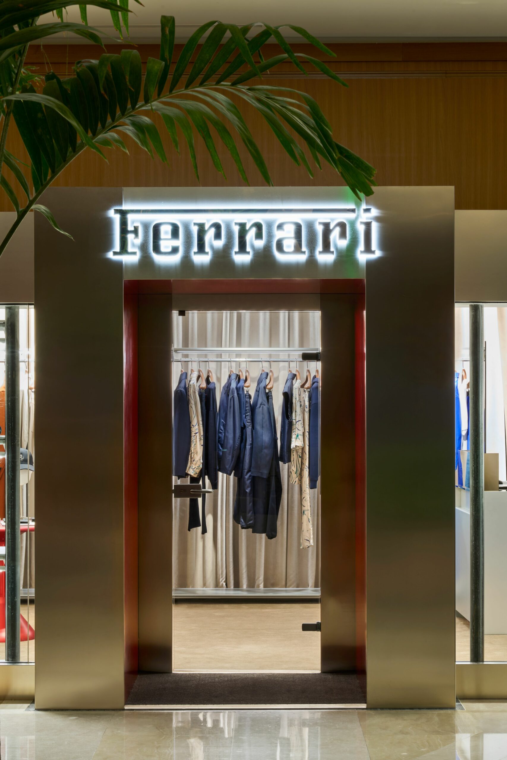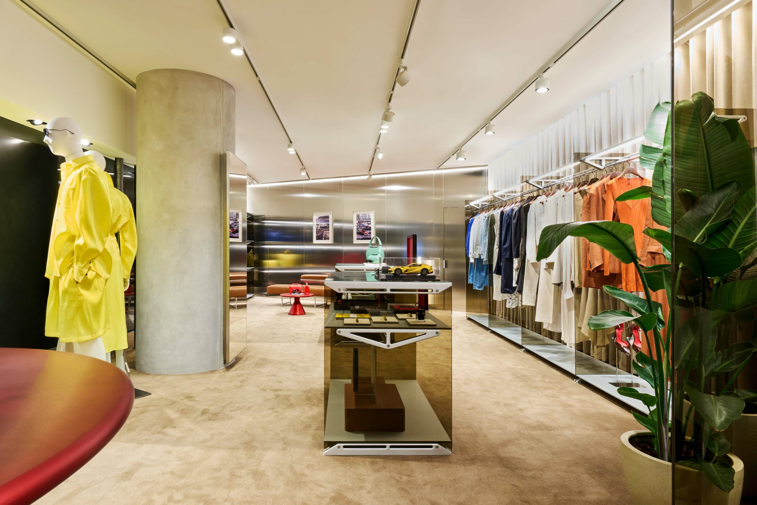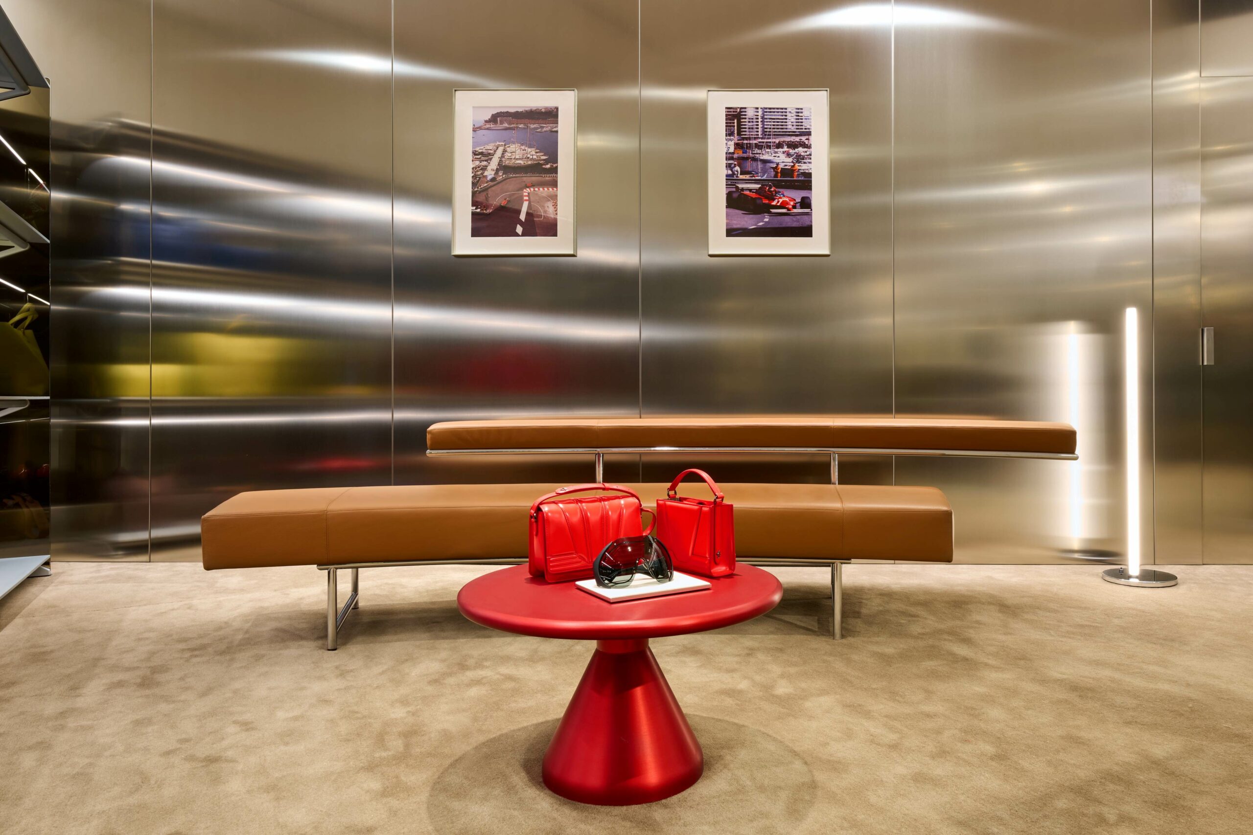 Concept exclusif, la boutique Ferrari allie une esthétique élégante au design méticuleux de la marque italienne et à son savoir-faire artisanal. La combinaison d’éléments luxueux et de matériaux innovants crée un contraste entre des textures douces et des accents modernes audacieux : mobilier en cuir, rideaux en Alcantara et tapis en laine se mêlent à des surfaces industrielles, offrant un équilibre harmonieux entre forme, matériau et couleur.