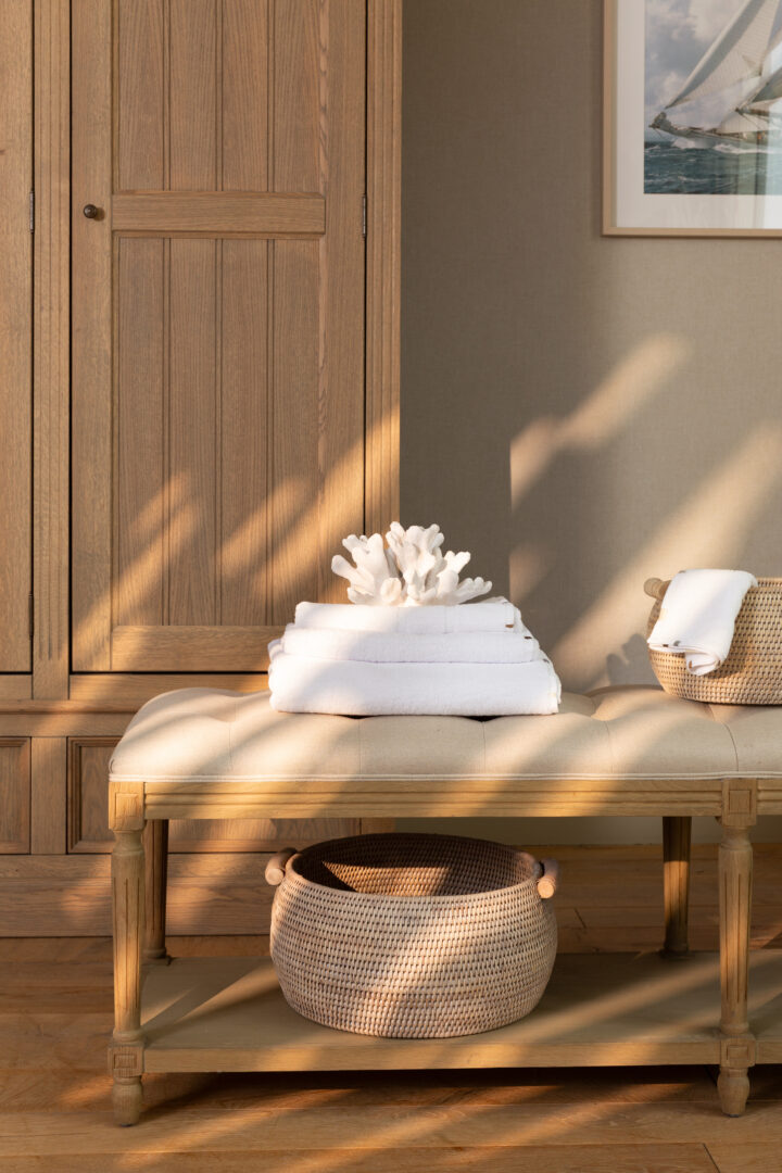L’inspiration marine se glisse avec finesse dans les éléments décoratifs : silhouettes de voiliers, coquillages délicatement disposés, photographies évoquant l’horizon salin. Rien n’est ostentatoire, tout est suggéré – comme un souvenir de vacances que l’on prolonge chez soi.