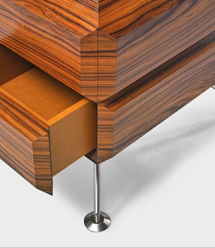 Matériaux & construction : placage palissandre Dos Santos, finition cire naturelle, système Bose® Soundtouch® intégré, paire d’enceintes Bose®, piètement en inox massif.