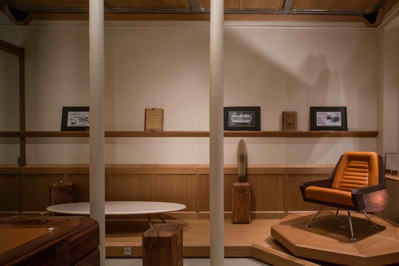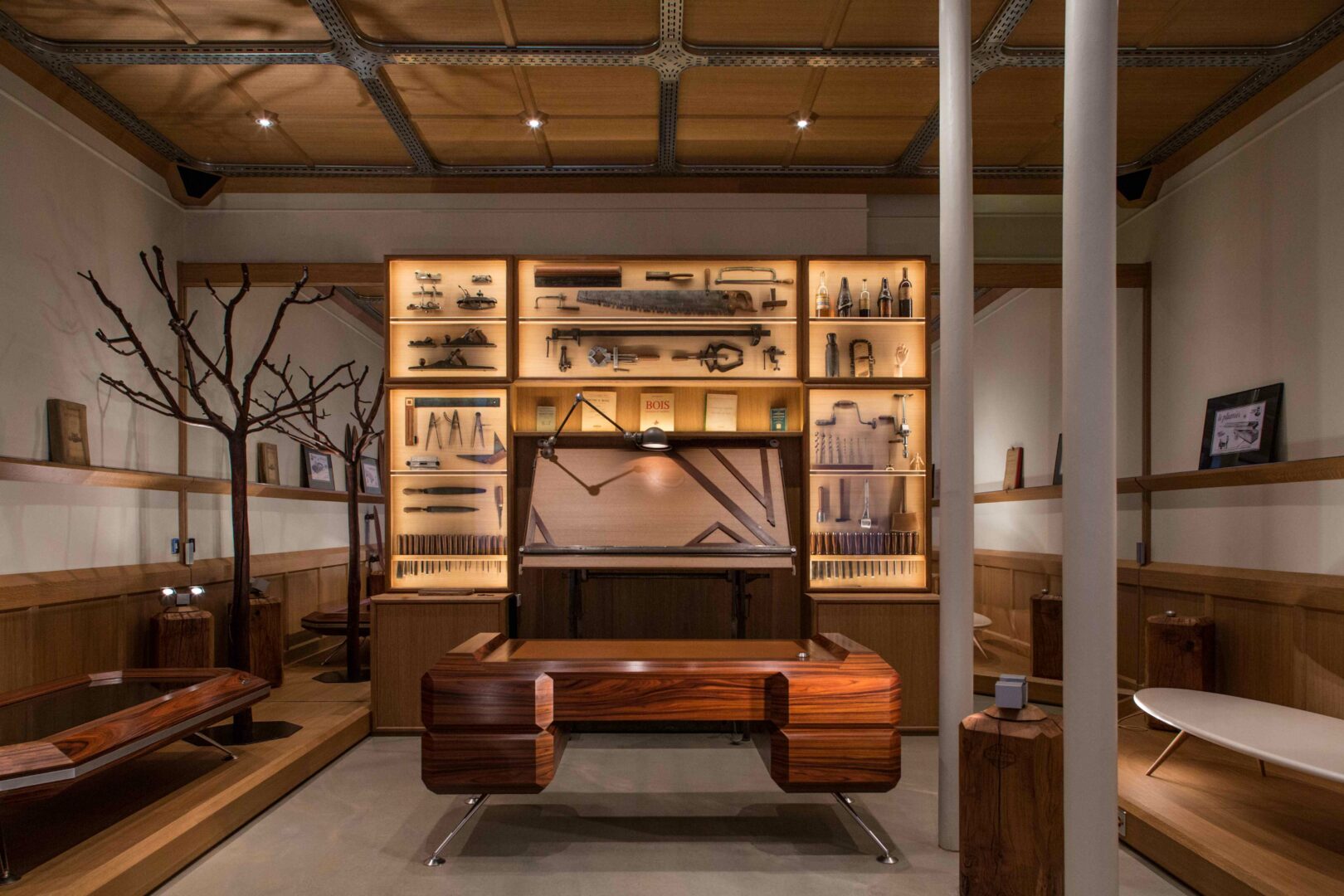Sur un panneau central, les outils anciens – ciseaux, varlopes, guillaumes – racontent une histoire silencieuse : celle d’une lignée d’artisans pour qui la précision de la main est un langage.