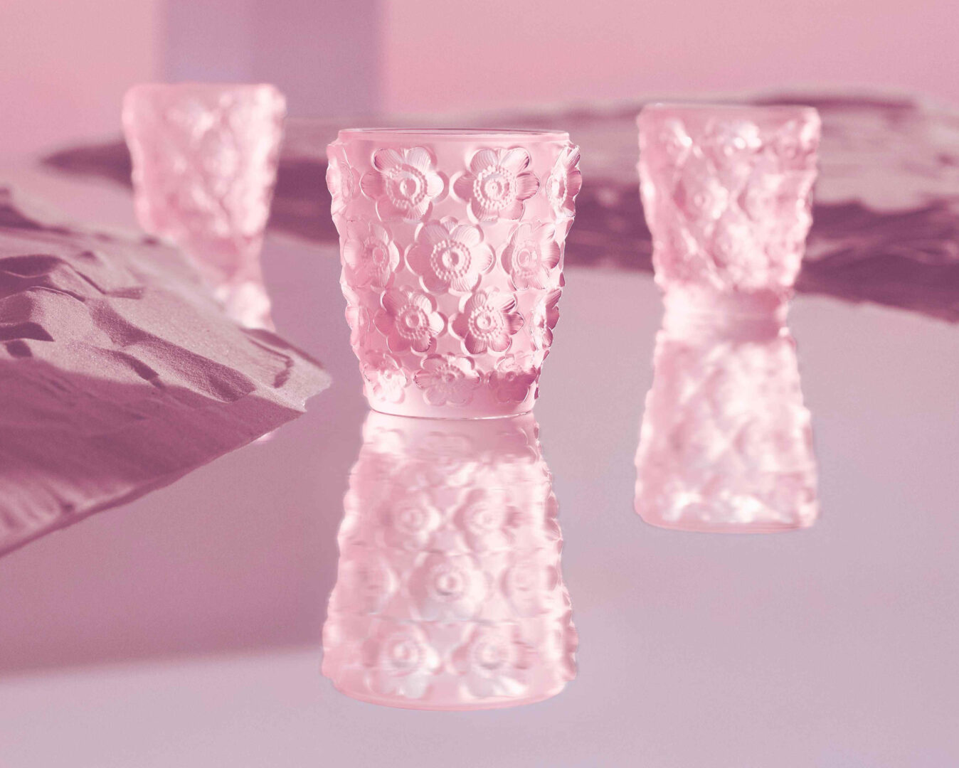Avec cette collection, la Maison explore une nouvelle fois la couleur. Appliquée en touche finale sous l’œil attentif des maîtres-verriers, une brume vaporeuse incolore, constituée de métaux précieux, notamment de l’or jaune, se révèle comme par magie à la recuisson et dévoile pour chaque pièce sa finition rose unique.