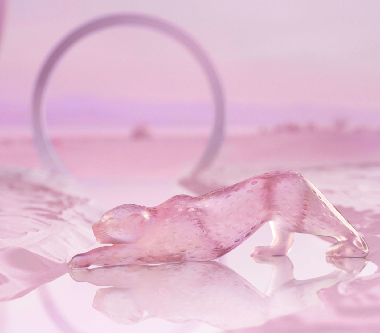Sculpture Panthère Zeila grand modèle – Cristal Incolore, Lustré rose – Dim. : H 11 x L 36.5 x l 17.5 cm – Poids : 2.6 kg – Fabriqué en France – Crédits photos ©dust.films