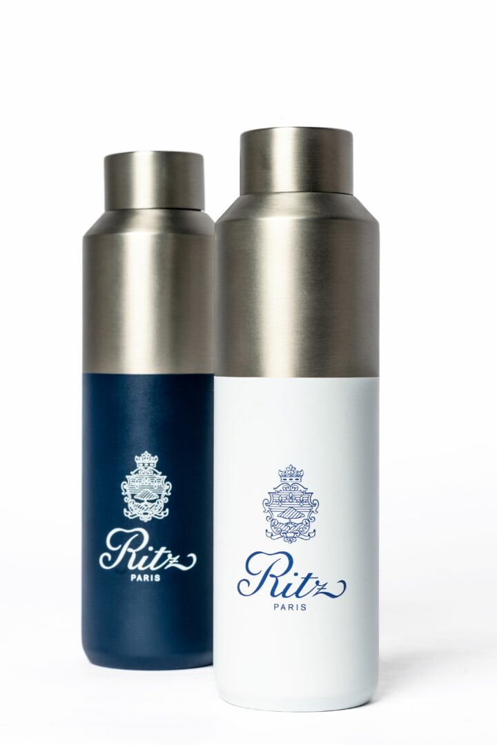 Leur design sobre et lumineux se décline en deux versions : l’une bleue, parée du logo du Ritz Paris et son iconique blason en blanc ; l’autre blanche, au logo bleu.