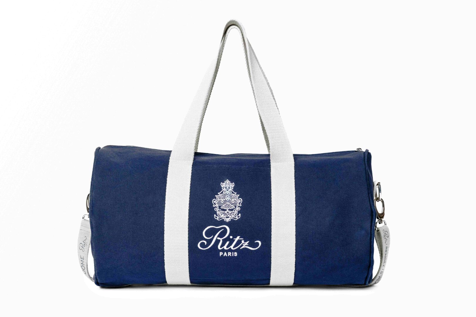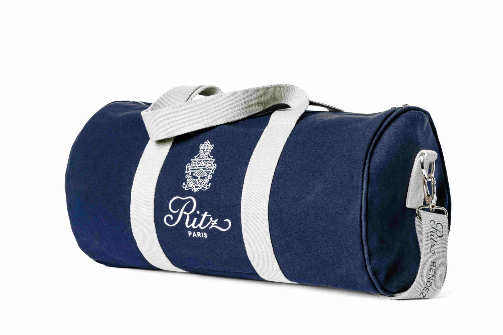 Le logo de l’hôtel est brodé en blanc et la sangle porte l’inscription « Rendez-vous 15 place Vendôme ».