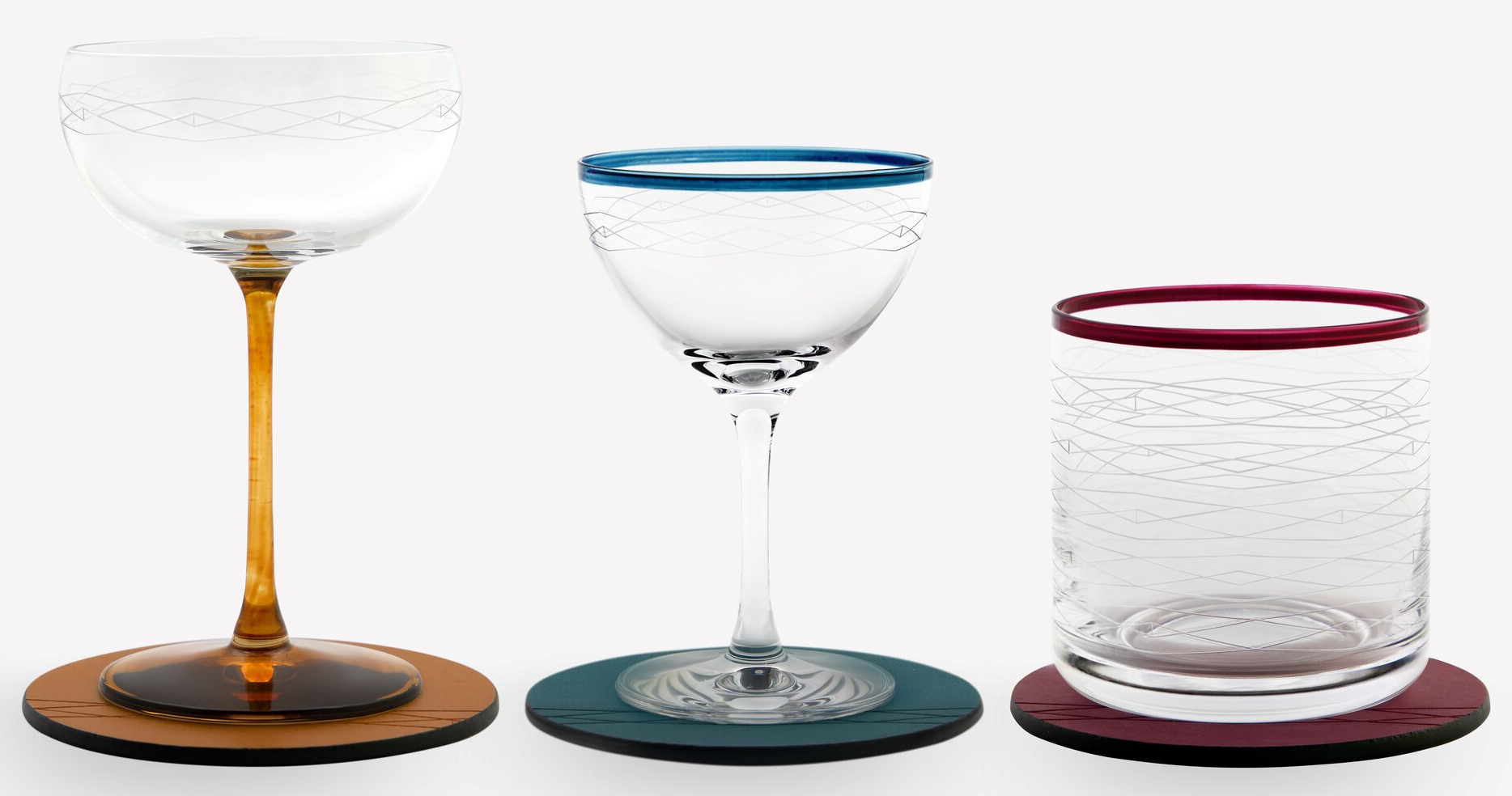 Couleurs pop et pigmentées, lignes élégantes et intemporelles : autant d’éléments piochés chez Maison Sarah Lavoine qui font de ces créations des pièces à collectionner. Soufflés et teintés, le verre Old Fashioned, le Nick & Nora et la coupe Martini sont proposés avec un dessous de verre assorti et reprennent le monogramme géométrique de MGallery -ici repensé aux couleurs emblématiques de Maison Sarah Lavoine, notamment la célèbre nuance ‘Bleu Sarah’.