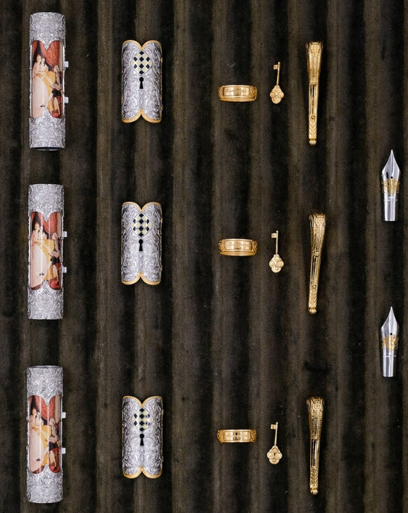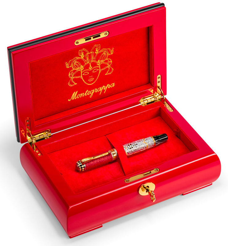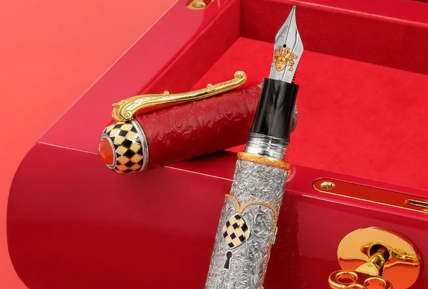 Les matériaux nobles –résines précieuses, laques profondes, cuir, argent sterling et or– s’allient pour offrir une prise en main élégante et une fluidité d’écriture inégalée. Les ornements évoquent le décor rococo du salon de Casanova et l’ambiance des canaux en contrebas racontée par le personnage le plus célèbre de la Sérénissime.