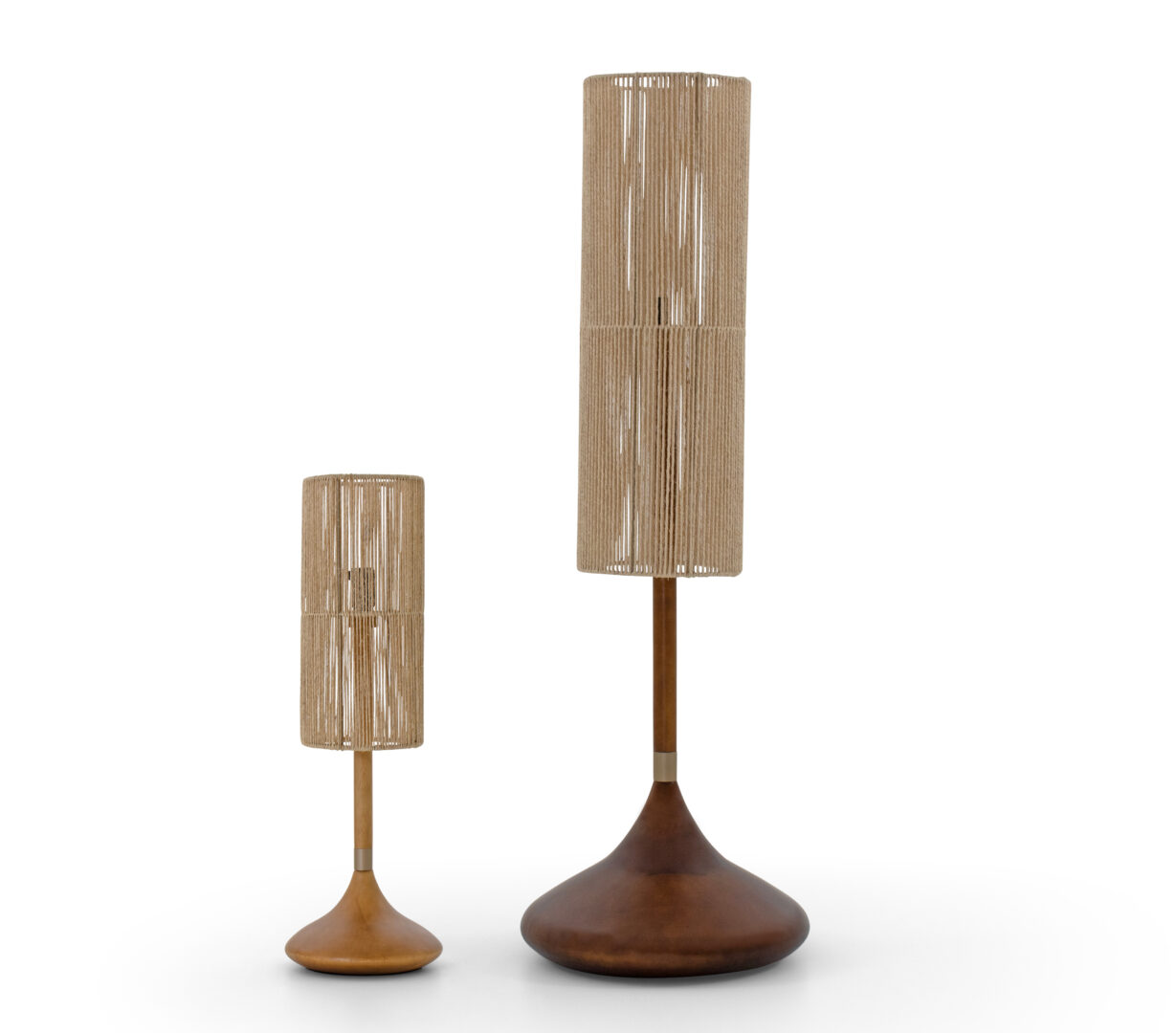 Luminaires Ballon – Design Tascieny Brandão – Base sculpturale en bois massif et abat-jour cylindrique tissé à partir de fibres naturelles – Lampe à poser : Ø. 21 x H. 65 cm – Lampadaire : Ø. 60 x H. 180 cm – Crédits photos ©Rua Madeira