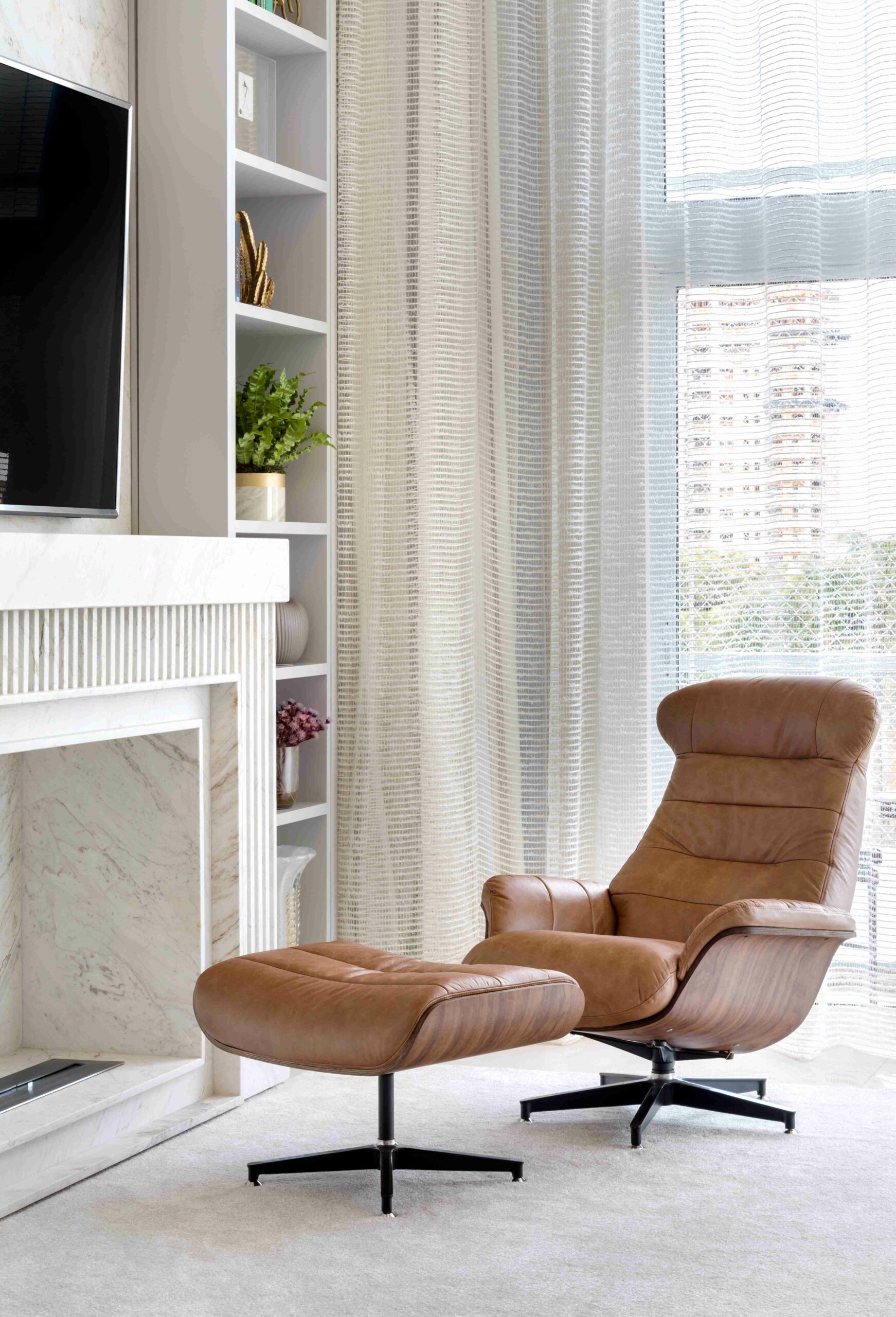 Fauteuil et repose-pieds Veloso – Structure en bois massif brésilien avec base en métal et finition en cuir de haute qualité – L. 81 x H. 98 x P. 90 cm – Crédits photos ©Rua Madeira