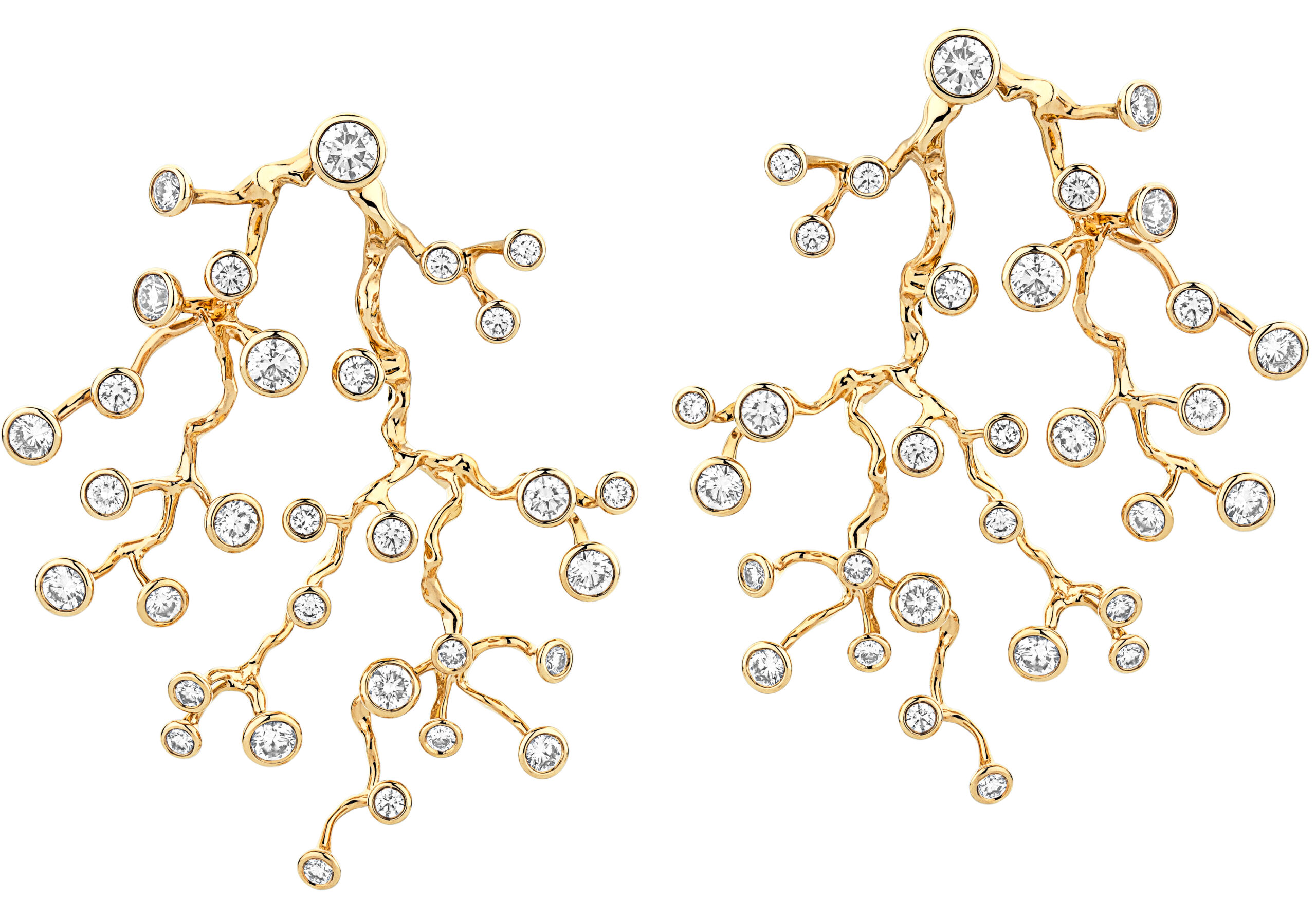 Branch Earrings : La créatrice brésilienne Cris Porto présente ici des boucles d’oreilles qui s’inspirent des formes organiques des branches d’arbres -fines, sinueuses, parfois entrelacées- pour créer un design à la fois naturel et sophistiqué. En or jaune 18 carats accompagnées de 62 diamants pour un poids total de 3,65 carats.