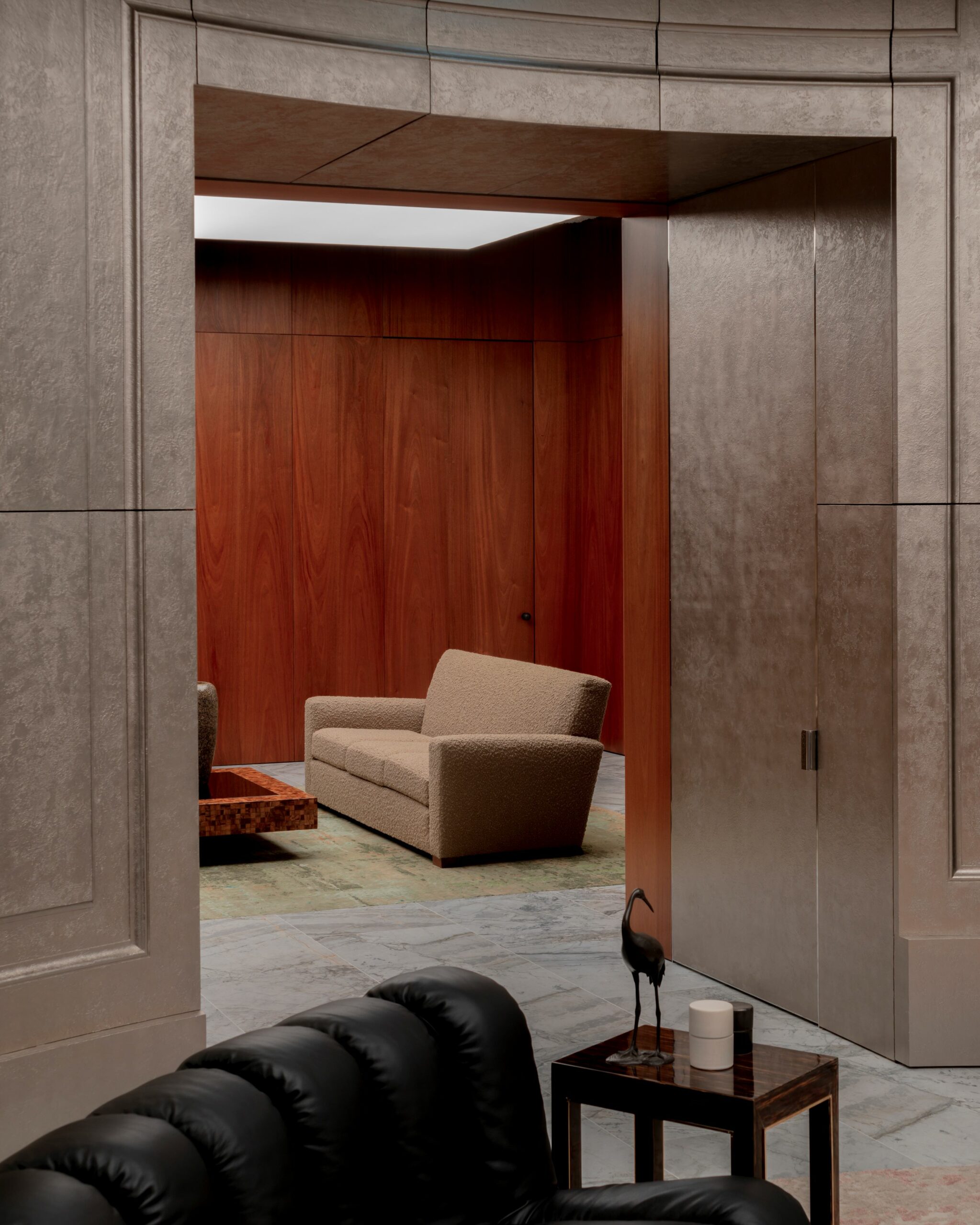 Le mobilier et les œuvres d’art inscrivent le lieu au cœur de l’héritage culturel de la Maison. Parmi les pièces soigneusement choisies, figurent une paire de fauteuils Süe & Mare, un lit de jour de Paul Poiret pour l’Atelier Martine, une table de François-Xavier Lalanne, ainsi que des créations de Jean-Michel Frank, Charlotte Perriand et Josef Hoffmann. Autant de signatures d’exception qui résonnent avec l’esprit collectionneur de Monsieur Saint Laurent et tissent un dialogue subtil entre histoire, savoir-faire et modernité.