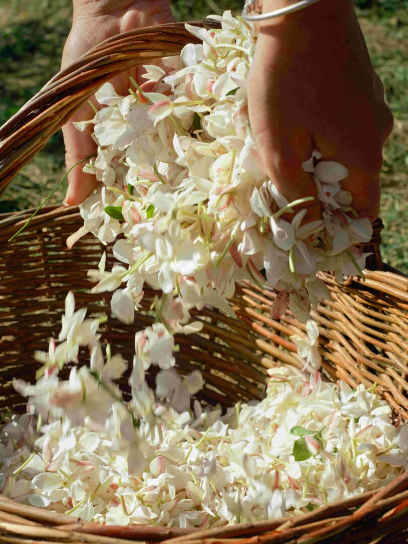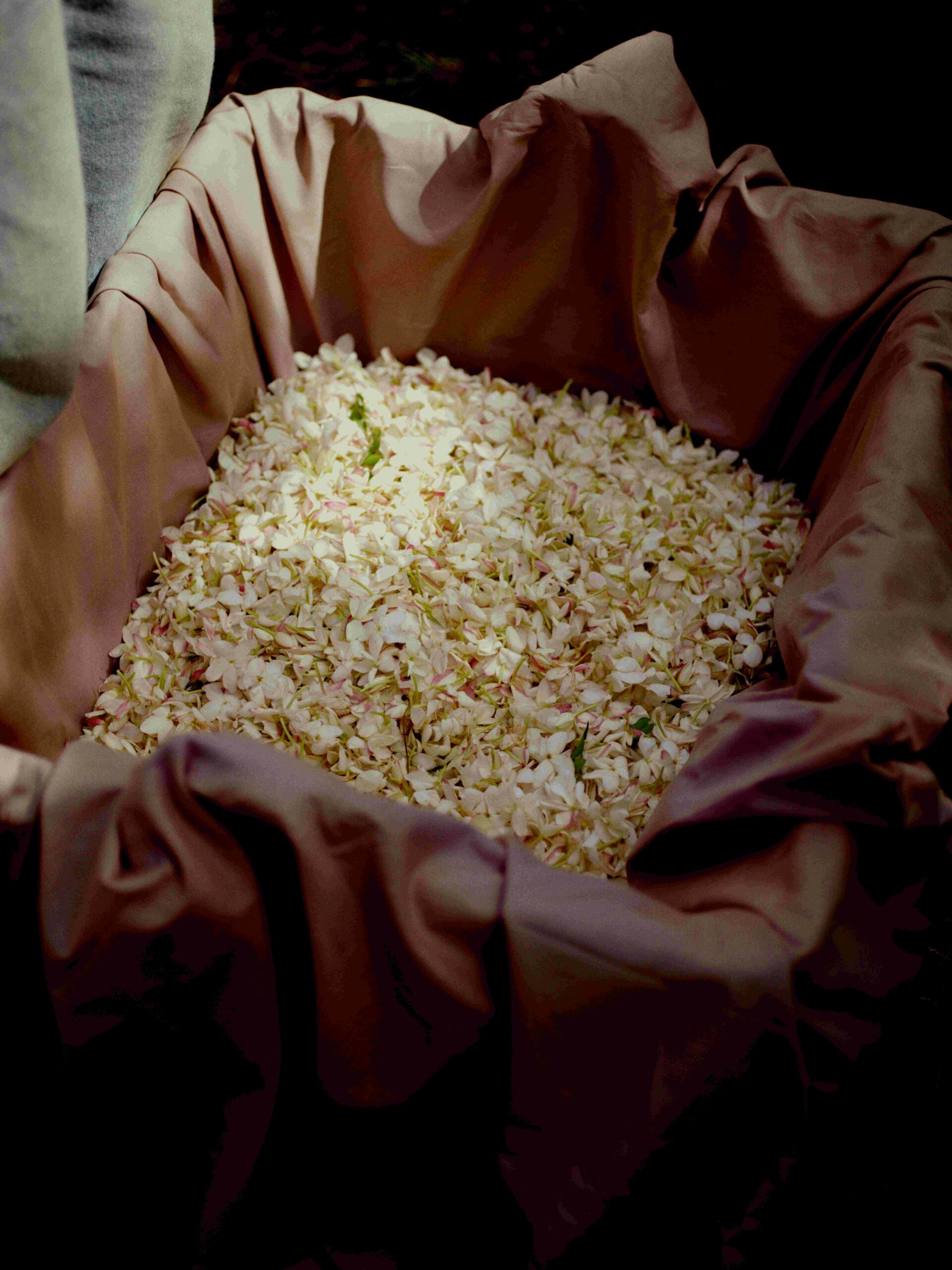 Répété plusieurs fois avec de nouvelles fleurs, jusqu’à ce que le beurre soit entièrement infusé par l’huile essentielle, ce processus permet de capturer chaque molécule olfactive et ses nuances, tout en préservant la complexité naturelle et la profondeur de la fleur dans l’essence d’enfleurage de jasmin. Il s’agit d’une méthode reposant sur un héritage précis où l’expertise humaine permet de faire ressortir la beauté de la nature.