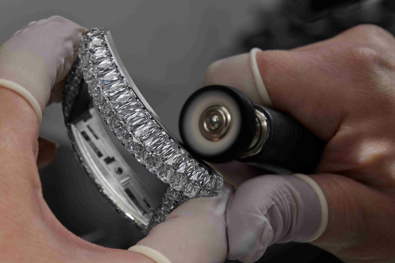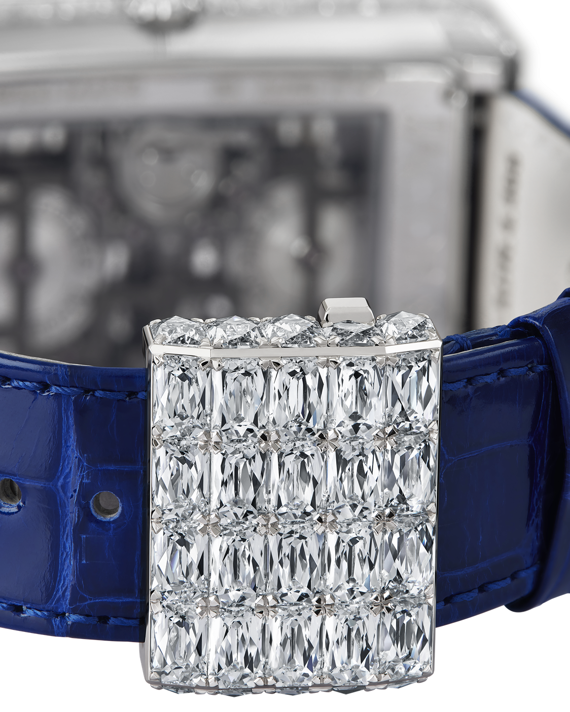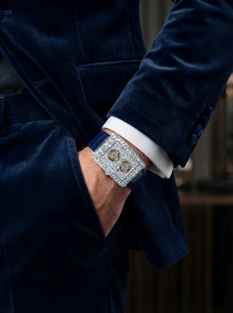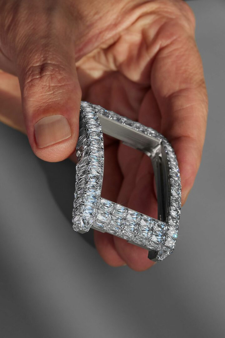 Cette innovation trouve sa première expression dans la Billionaire Double Tourbillon Angel Cut. Pour la première fois, une montre accueille des diamants taillés selon cette nouvelle signature. Son boîtier en or blanc de 54 x 41 mm, est serti de 98 diamants taille Angel totalisant plus de 51 carats. Certaines pierres atteignent des dimensions exceptionnellement généreuses, généralement réservées aux diamants de centre, ce qui confère à l’ensemble une présence rare et une intensité visuelle immédiate.