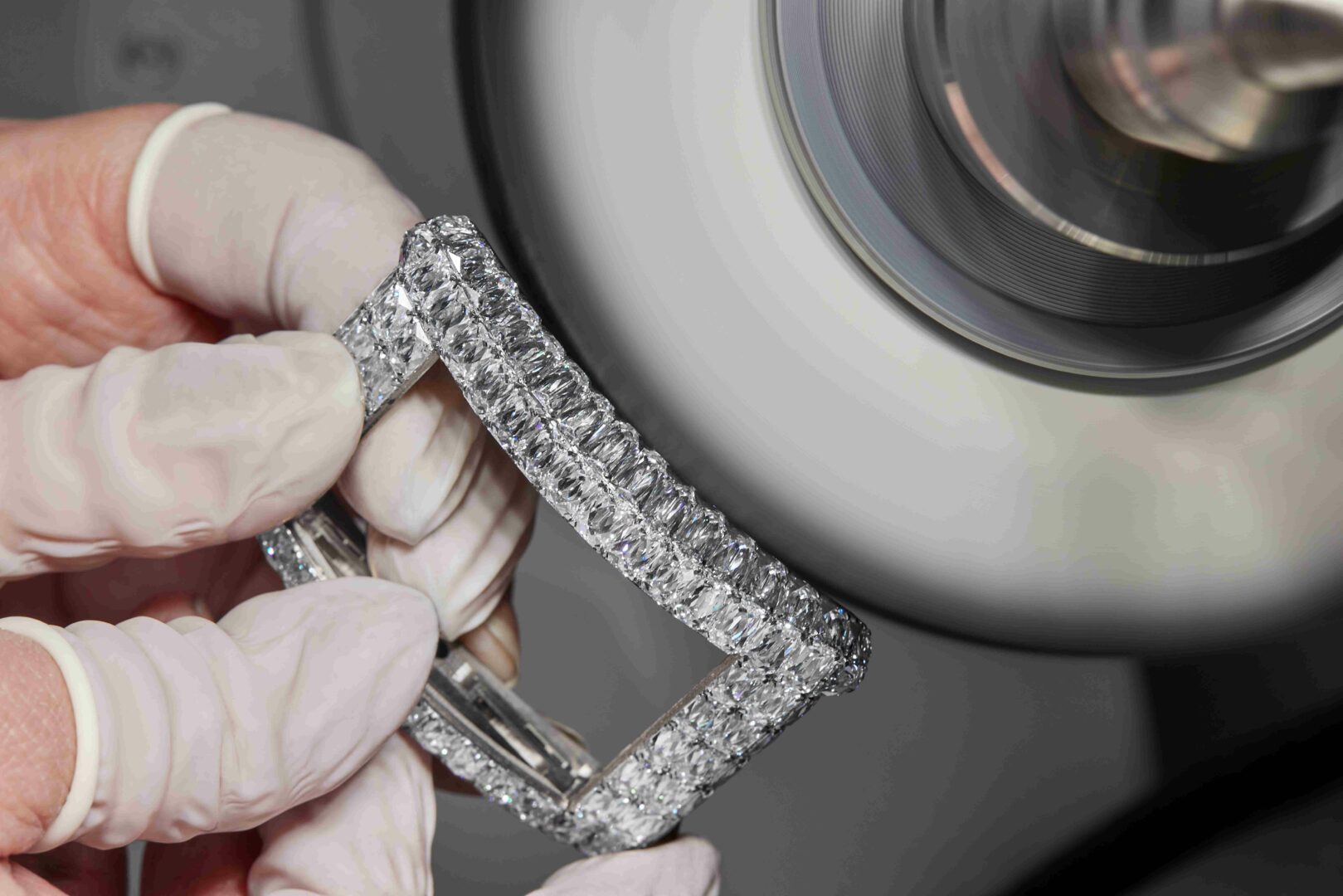 Au cœur de sa conception, la taille Angel répond à une problématique ancienne en gemmologie : sublimer les pierres rectangulaires sans compromettre leur rendement ni leur élégance, tout en optimisant la restitution de la lumière. Plutôt que de multiplier les facettes, Jacob & Co. a choisi une approche plus exigeante, fondée sur la maîtrise des proportions et des angles. Chaque ligne, chaque transition a été pensée avec une précision extrême, dans une quête d’équilibre absolu.