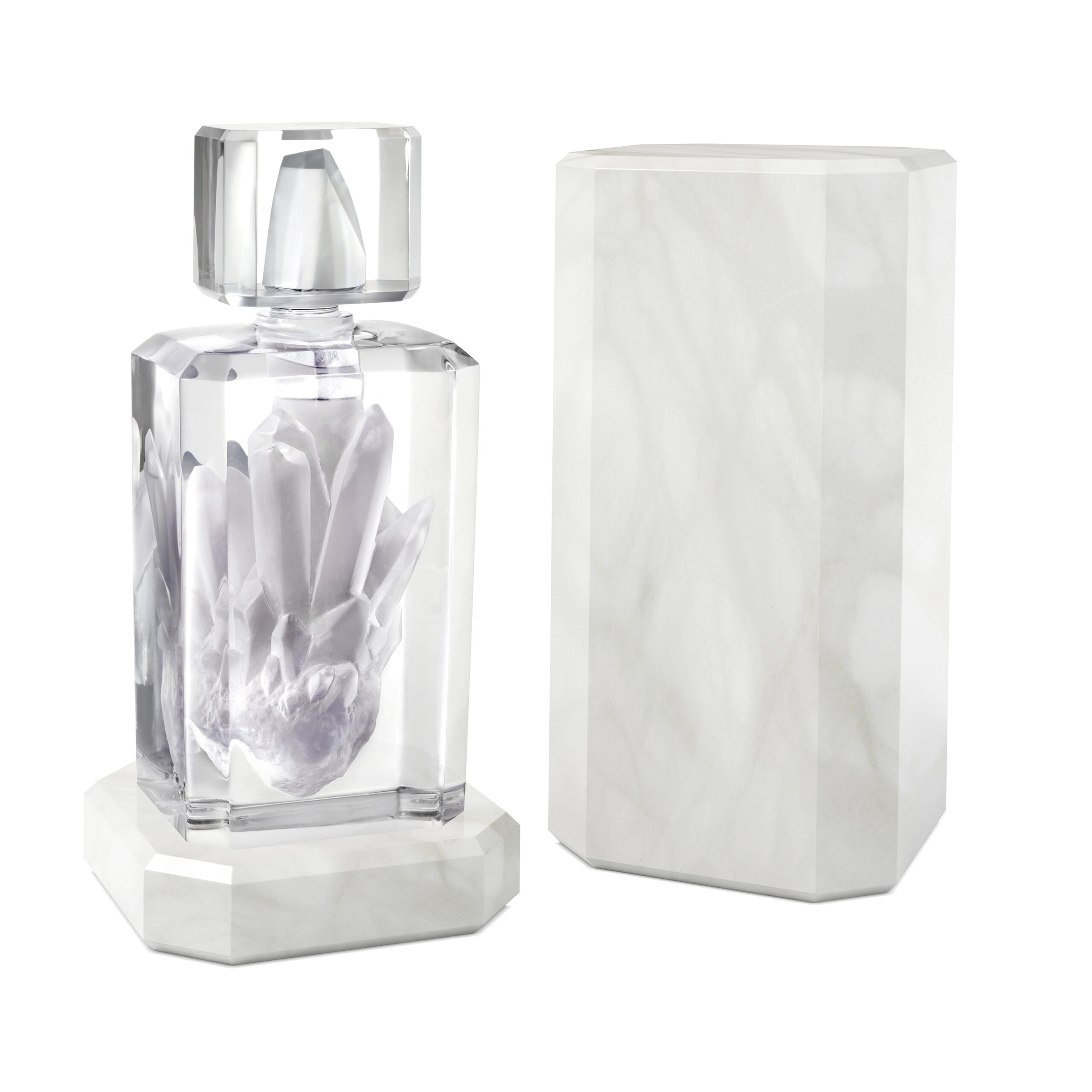 Pour sublimer le cristal du flacon, Dualité, Crystal Edition Perfume est niché dans un écrin en albâtre pur et lumineux, une matière translucide aux marbrures délicates qui procure un éclat éthéré. Associé au flacon, l’écrin en albâtre se transforme en un fascinant piédestal, évoquant une colonne romaine et donnant vie à une installation artistique mêlant vision créative et sophistication intemporelle.