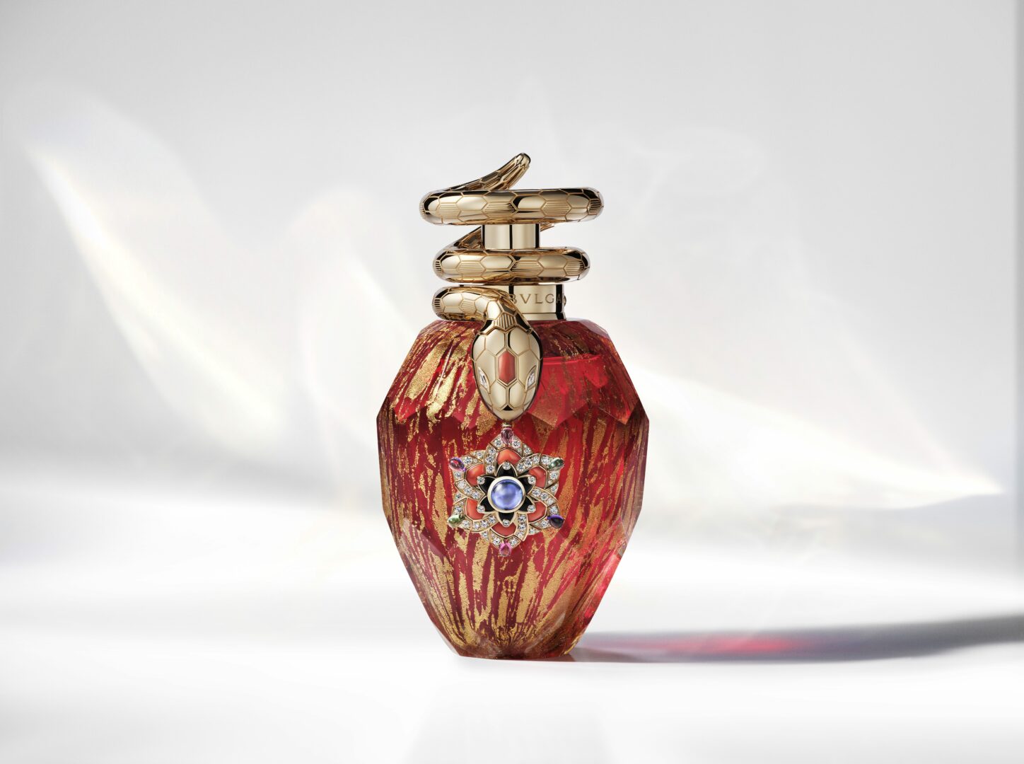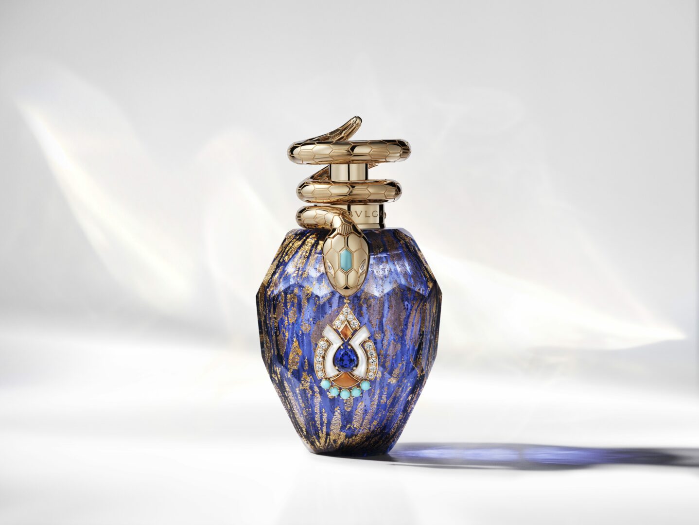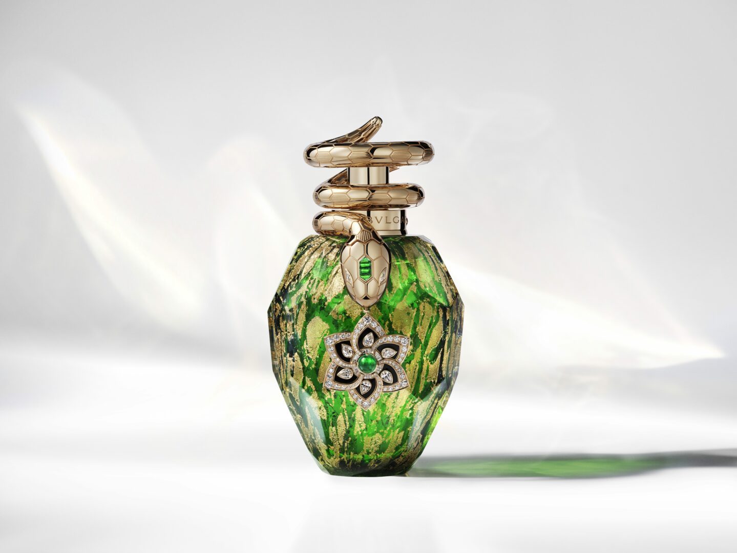 La signature ambrée florale se décline dans trois flacons sublimes, symbiose parfaite entre les deux mondes de la Haute Parfumerie et de la Haute Joaillerie. Sous le verre raffiné de Murano, des ingrédients olfactifs exceptionnels gardés par le Serpenti sont sublimés par une pièce unique de Haute Joaillerie. Sertie de pierres précieuses dans les ateliers Bvlgari à Rome, elle se transforme en broche pour refléter l’excellence du design, de l’artisanat et des matières premières exclusives.