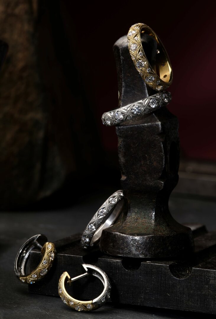 La collection Serpentis de Folium perpétue cet héritage dans une nouvelle ère, transformant le motif emblématique du serpent en un langage sculptural de métal et de lumière. Chaque bijou s’inspire de la géométrie de la peau du serpent, avec son motif répétitif en losanges qui change d’échelle le long de son corps, à la fois hypnotique et farouchement protecteur. Le Maître-orfèvre Myles Ryan grave ces formes à la main, sculptant chaque écaille avec la même précision que celle autrefois accordée aux bijoux vintage du désert et aux parures cérémonielles.