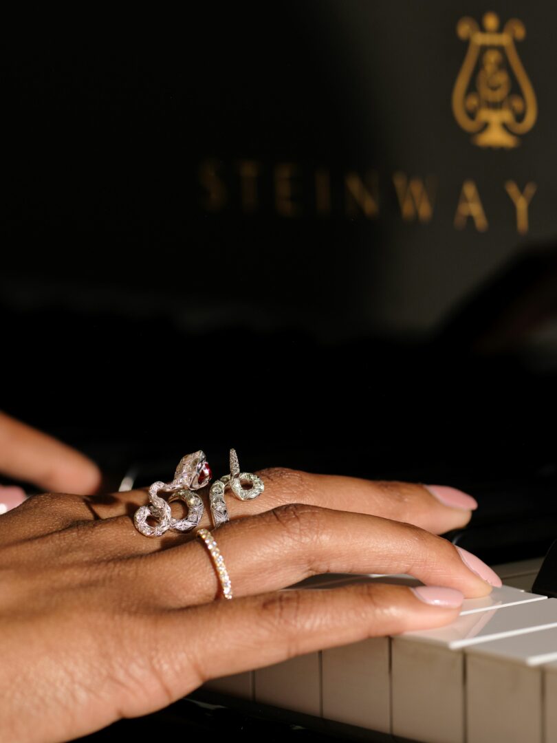 Les diamants sont sertis dans les alvéoles gravées comme des gouttes de lumière emprisonnées entre les écailles, évoquant les reflets du soleil sur le corps enroulé d’un serpent. Le motif devient rythmé, architectural et profondément tactile : un murmure de mouvement, même au repos. Sous forme de bagues, Serpentis devient une boucle de protection continue, un anneau ondulé d’écailles qui encercle le doigt avec une force tranquille.