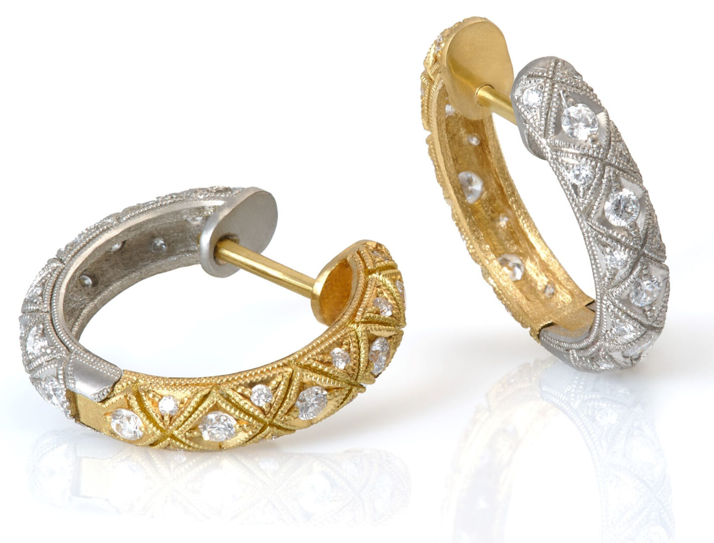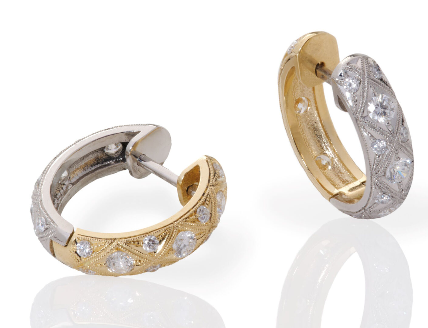 Boucles d’oreilles Huggie réversibles 4 mm – Diamants D-G VS de 0,86 carat au total – 16 mm de diamètre, 4 mm de largeur – Or jaune 18 carats – platine – diamant – Crédits photos ©Ella Sophie