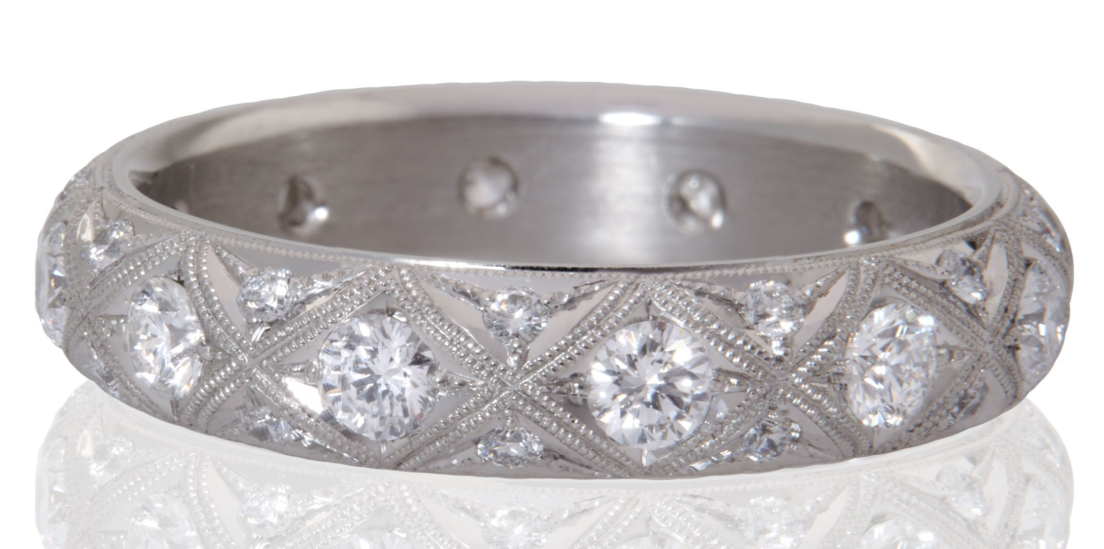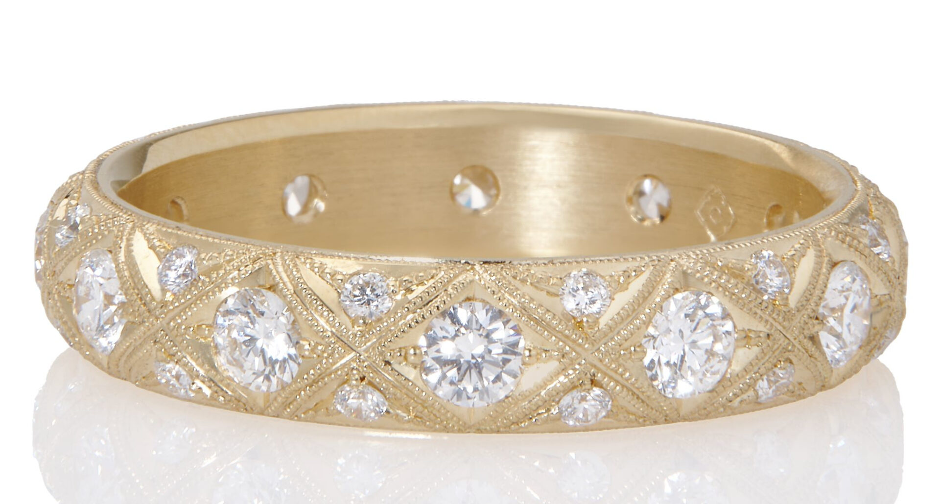 Bague Eternity 4,5 mm en or jaune : 1 CTW D-G VS Diamants – Largeur : 4,5 mm – Or jaune 18 carats – Diamant – Crédits photos ©Ella Sophie