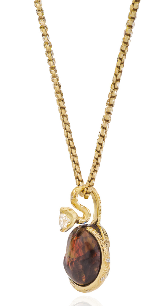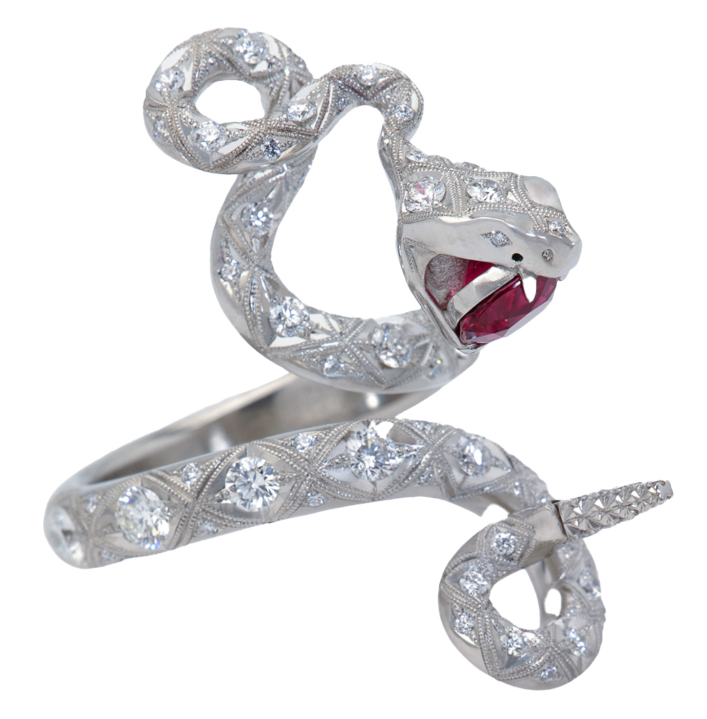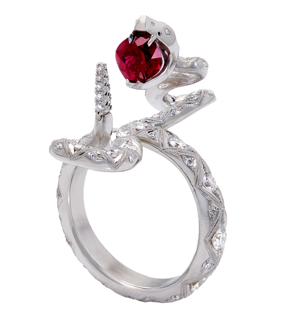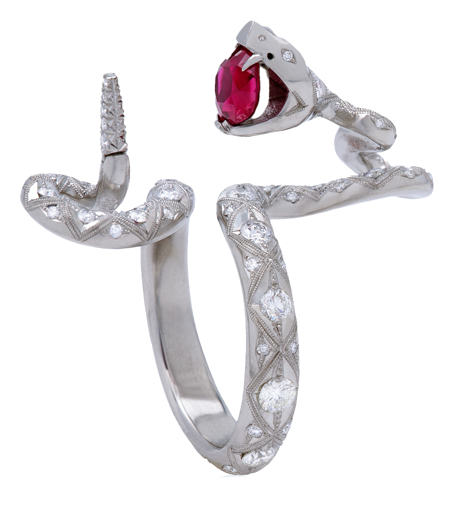 « Quand j’étais enfant, dans le nord de la Californie, j’ai vécu plusieurs expériences intenses avec des serpents à sonnette (…). Cela n’a pas été traumatisant, mais m’a ouvert les yeux sur la puissance de ces créatures. Très paisibles et discrètes, elles sont pourtant prêtes à frapper si elles sont provoquées. C’est ce sentiment de puissance et de paix qui a donné naissance à la collection Serpentis (…). La forme et le style des pièces Serpentis sont le résultat de l’union entre un design vintage et l’audace de l’utiliser de manière non conventionnelle. »