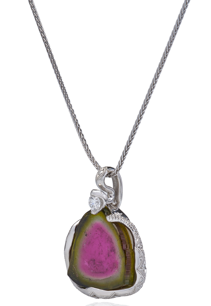 Pendentif tourmaline pastèque : Tourmaline pastèque 8,3 carats et diamants 0,31 carat – Chaîne 45 cm – Matériaux : platine – tourmaline – diamant – Crédits photos ©Ella Sophie