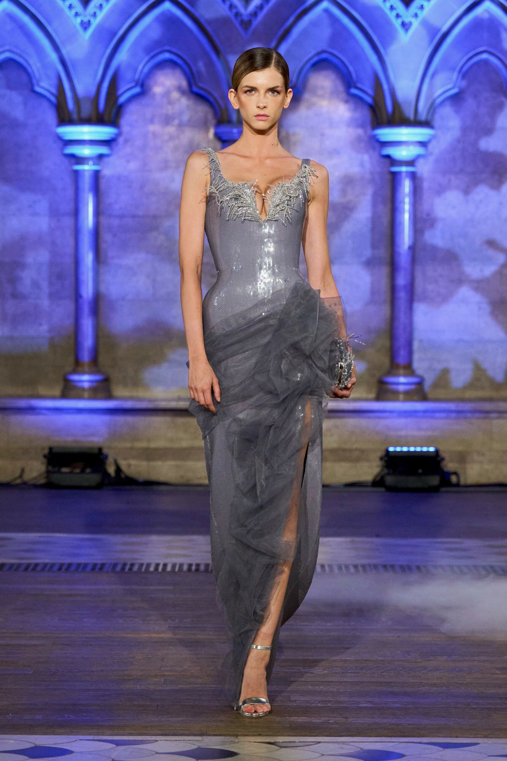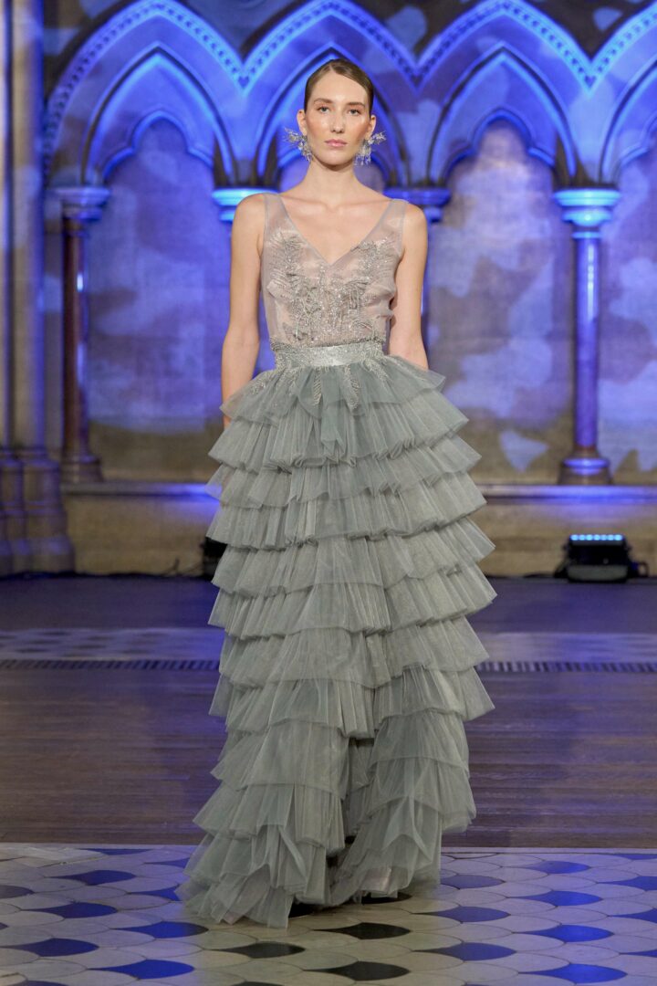 Les sequins gris, drapés dans du tulle vaporeux, stimulent l’imagination par leur ressemblance avec un lac froid et le brouillard venu lui rendre visite.