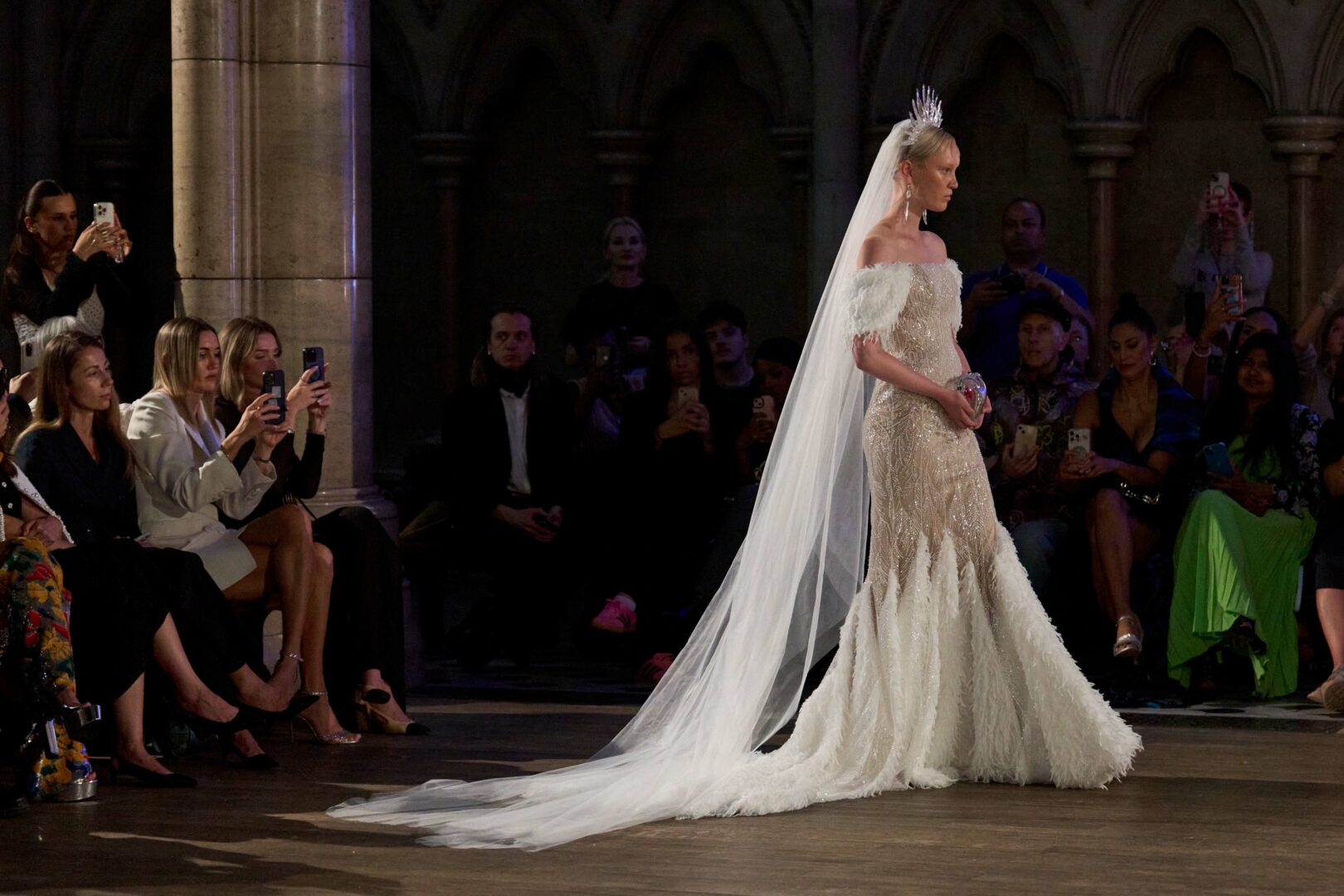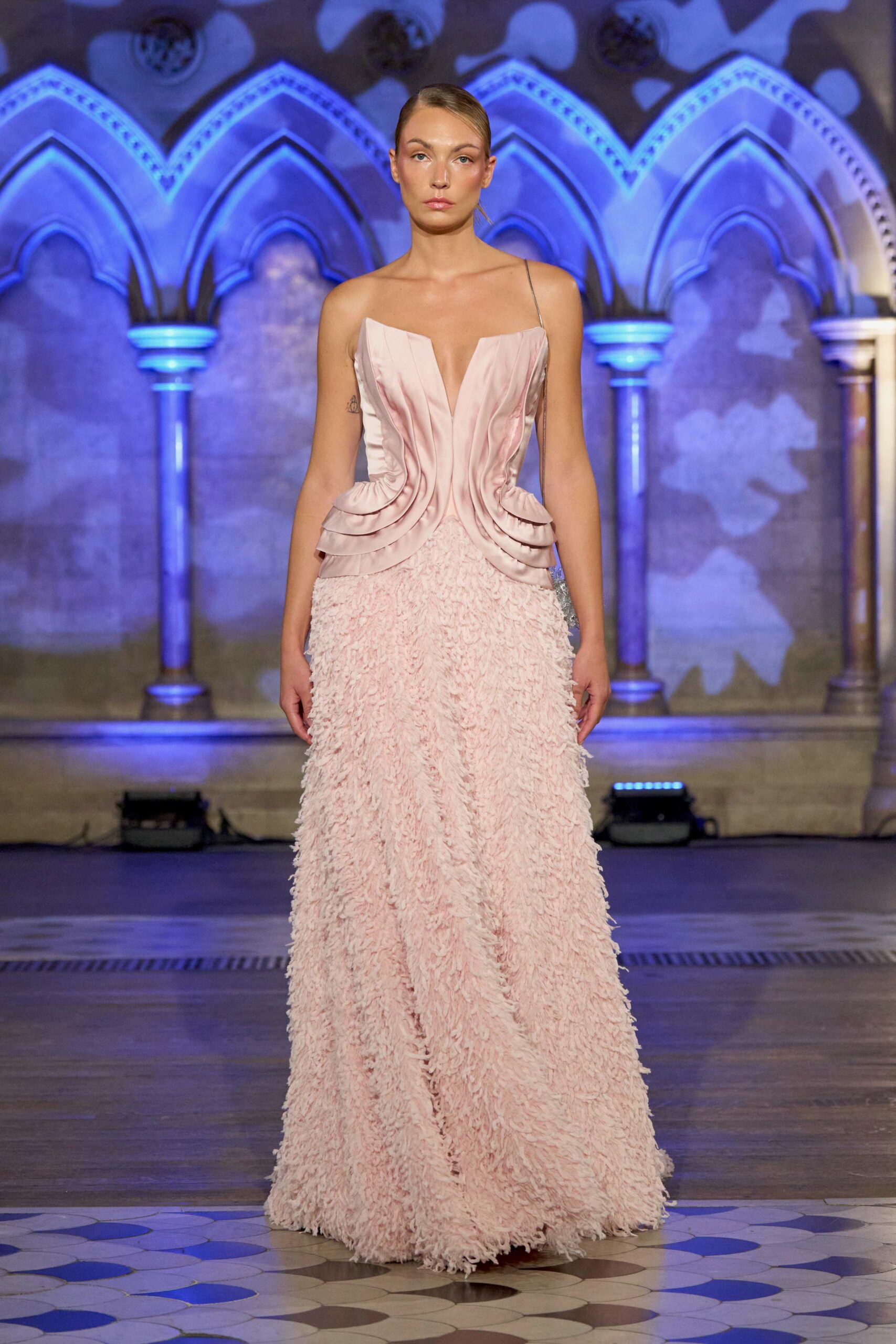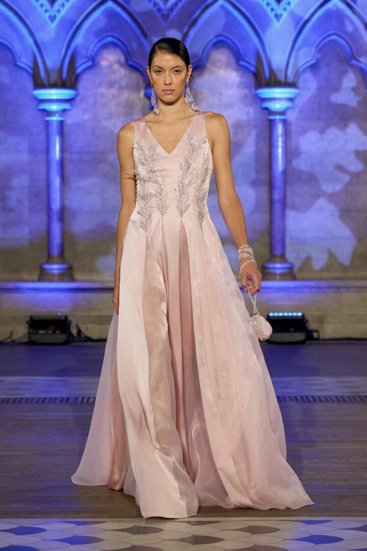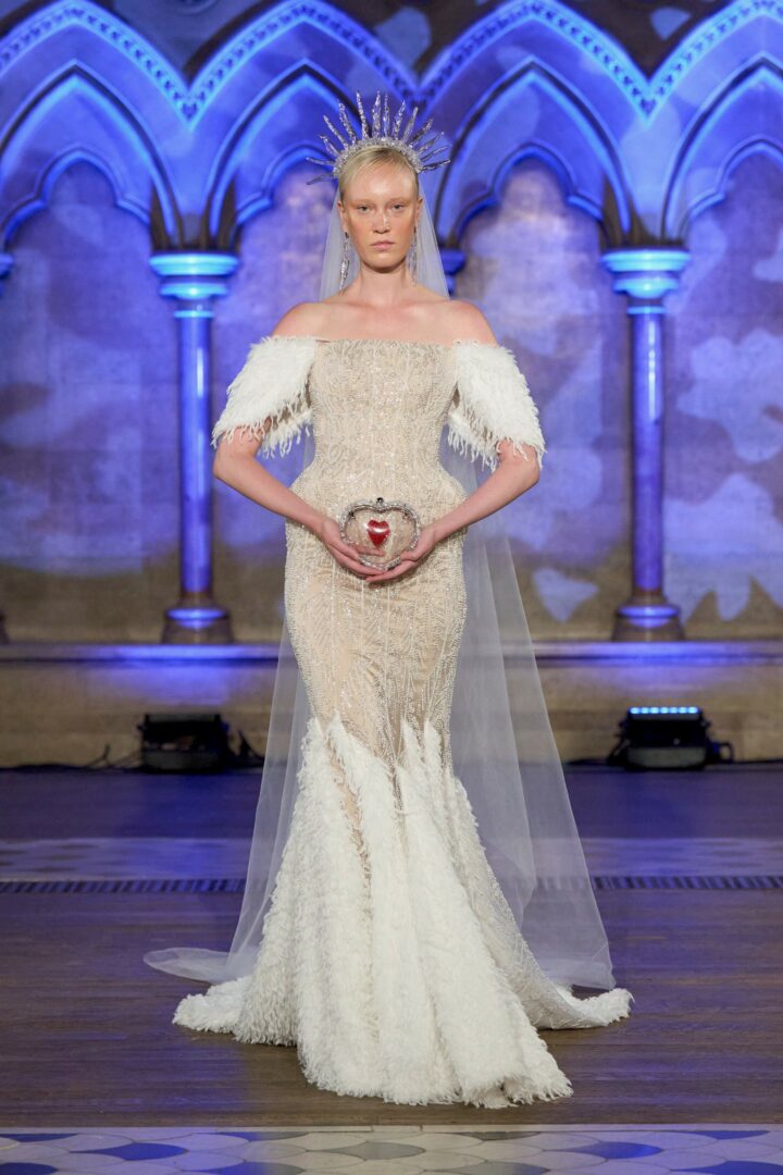 Le rose incarne un ciel du soir mystique, annonciateur d’une chute de neige matinale. Un élément occupe une place toute particulière dans la collection Ice Queen : la dentelle, favorite de la créatrice. Incrustée de perles et de perles de verre, elle retranscrit avec justesse la beauté complexe et le souffle glacé du givre. Et que dire de la majestueuse couronne de la mariée, composée de véritables stalactites d’apparence -entièrement réalisées à la main- une création que la Reine des Neiges elle-même aurait sans doute approuvée si elle venait à visiter notre monde.
