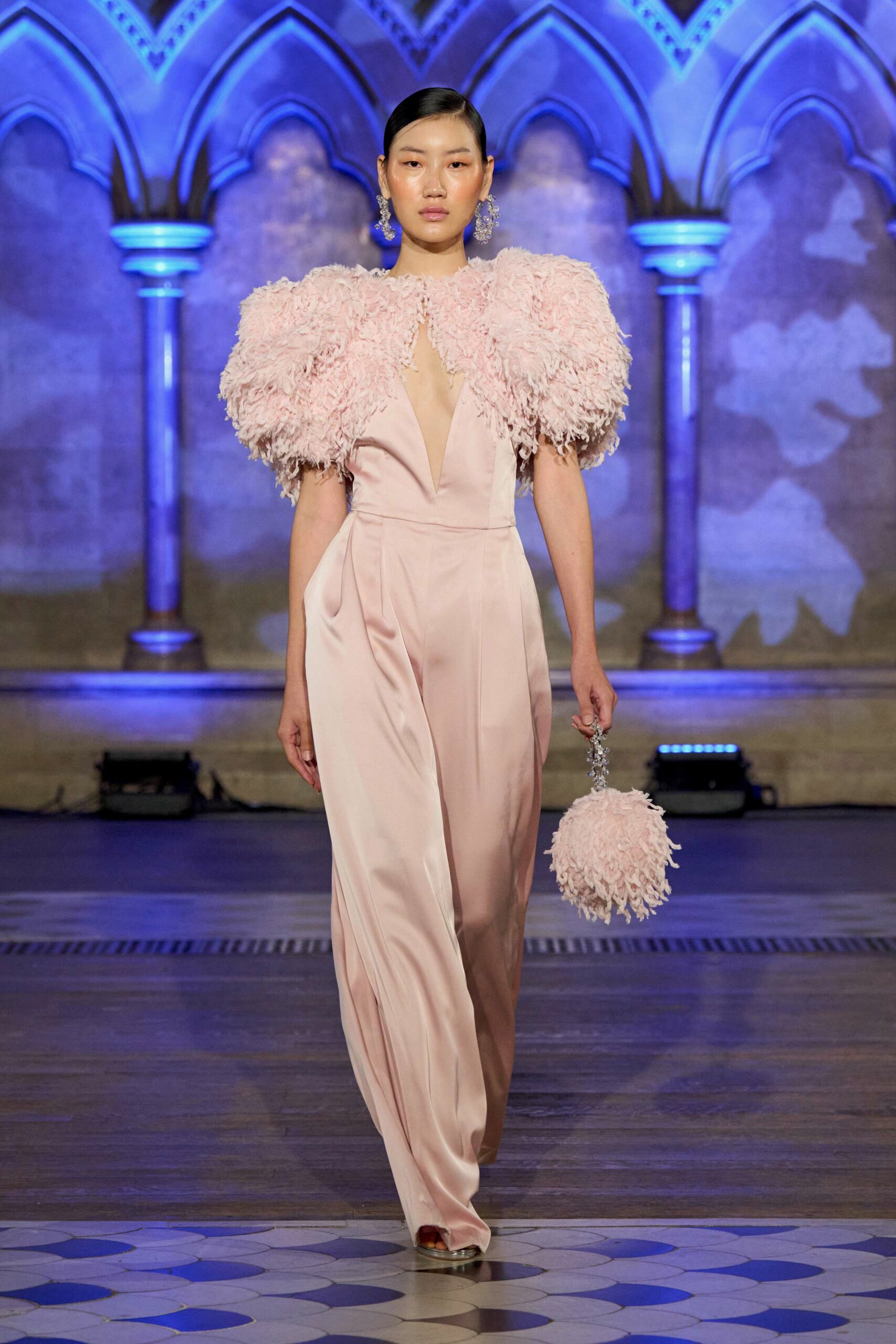 Dans la collection, la neige scintillante et duveteuse est évoquée par des détails en fausse fourrure, tandis que les branches d’arbres glacées et l’eau figée sont représentées avec une précision fantastique à travers des broderies et des accessoires en cristaux -chaque étape étant réalisée à la main par les talentueuses couturières de la maison. Le choix des tissus et de la palette chromatique ne doit rien au hasard.