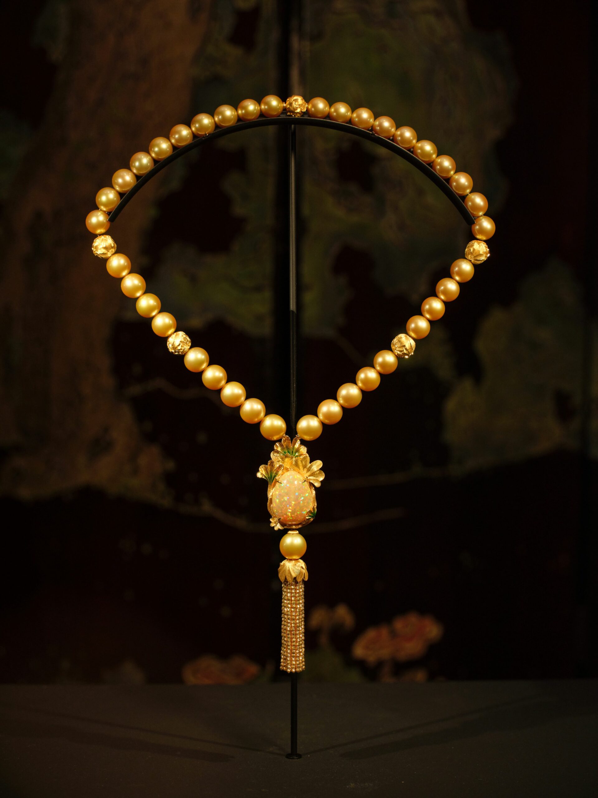 En son cœur brille une opale naturelle rare de 43,95 carats. Elle s’accorde avec 65 Perles dorées des mers du Sud, 14 – 16,3 mm.