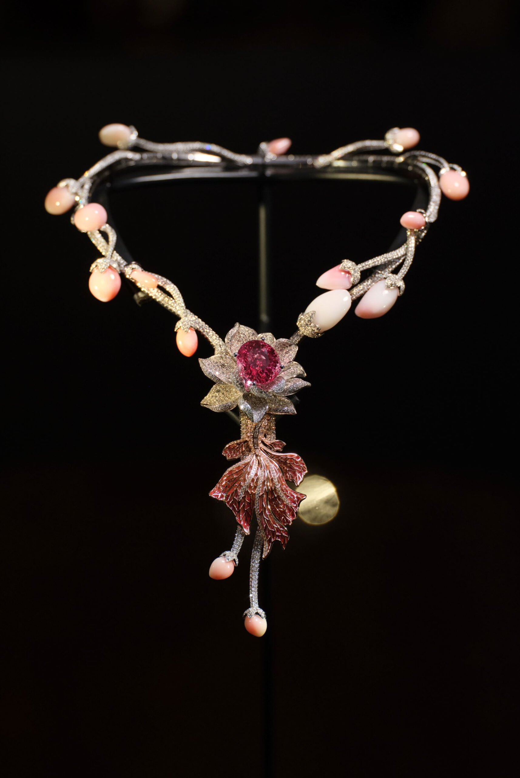 Pierre Principale : Un saphir Padparadscha de 22,61 carats -joyau d’exception, parmi les plus rares jamais certifiés. Le design suit le mouvement sinueux de branches florales, trouvant un équilibre subtil entre forme et fluidité. De chaque côté, des boutons de perles de conque naturelles aux teintes rosés -évoquant des bourgeons flottant à l’aurore. À son extrémité, un poisson doré en émail plique-à-jour glisse tel une silhouette sur les eaux du matin -éveillant un rêve d’Orient dissimulé dans la lumière impressionniste.