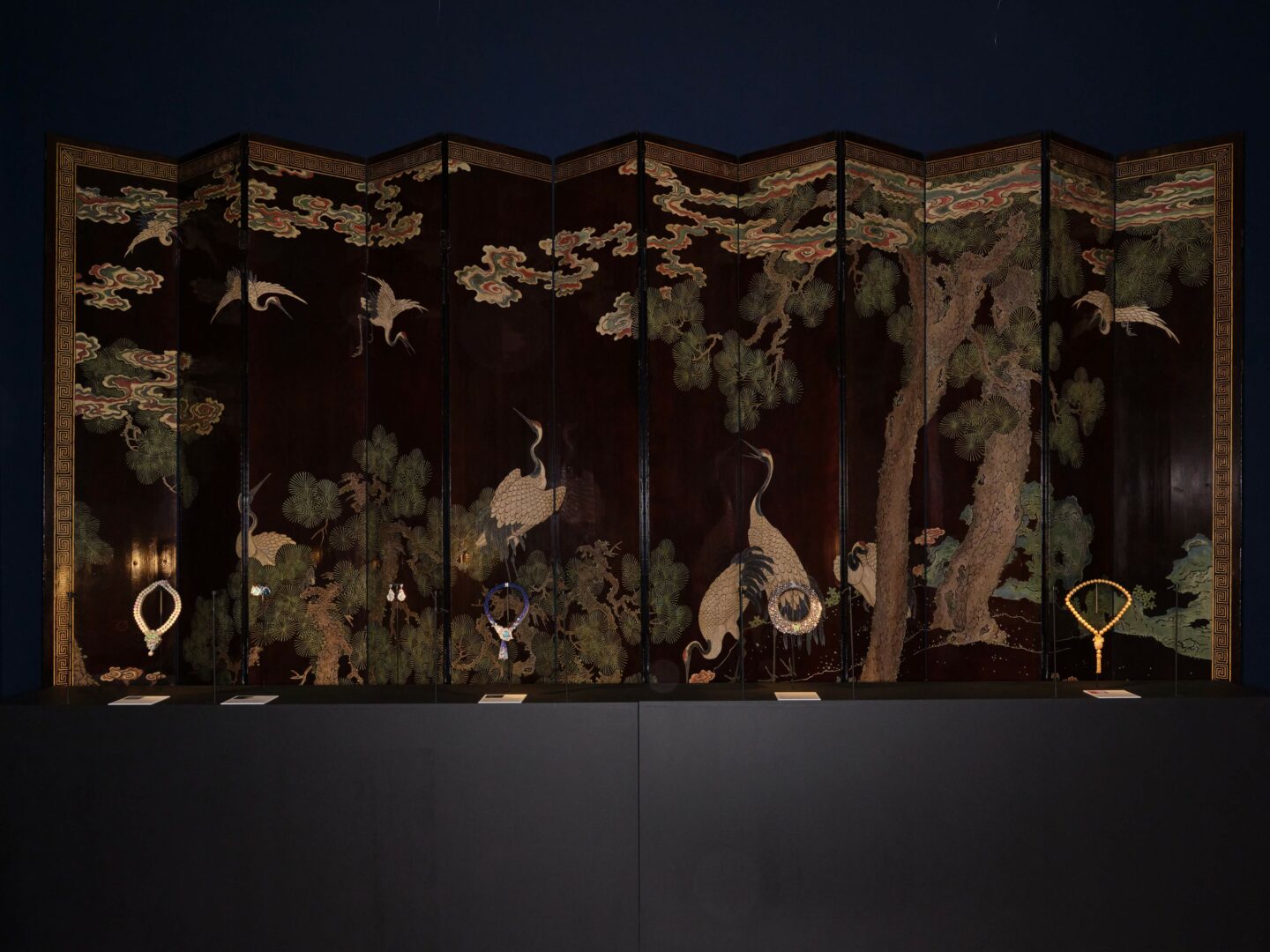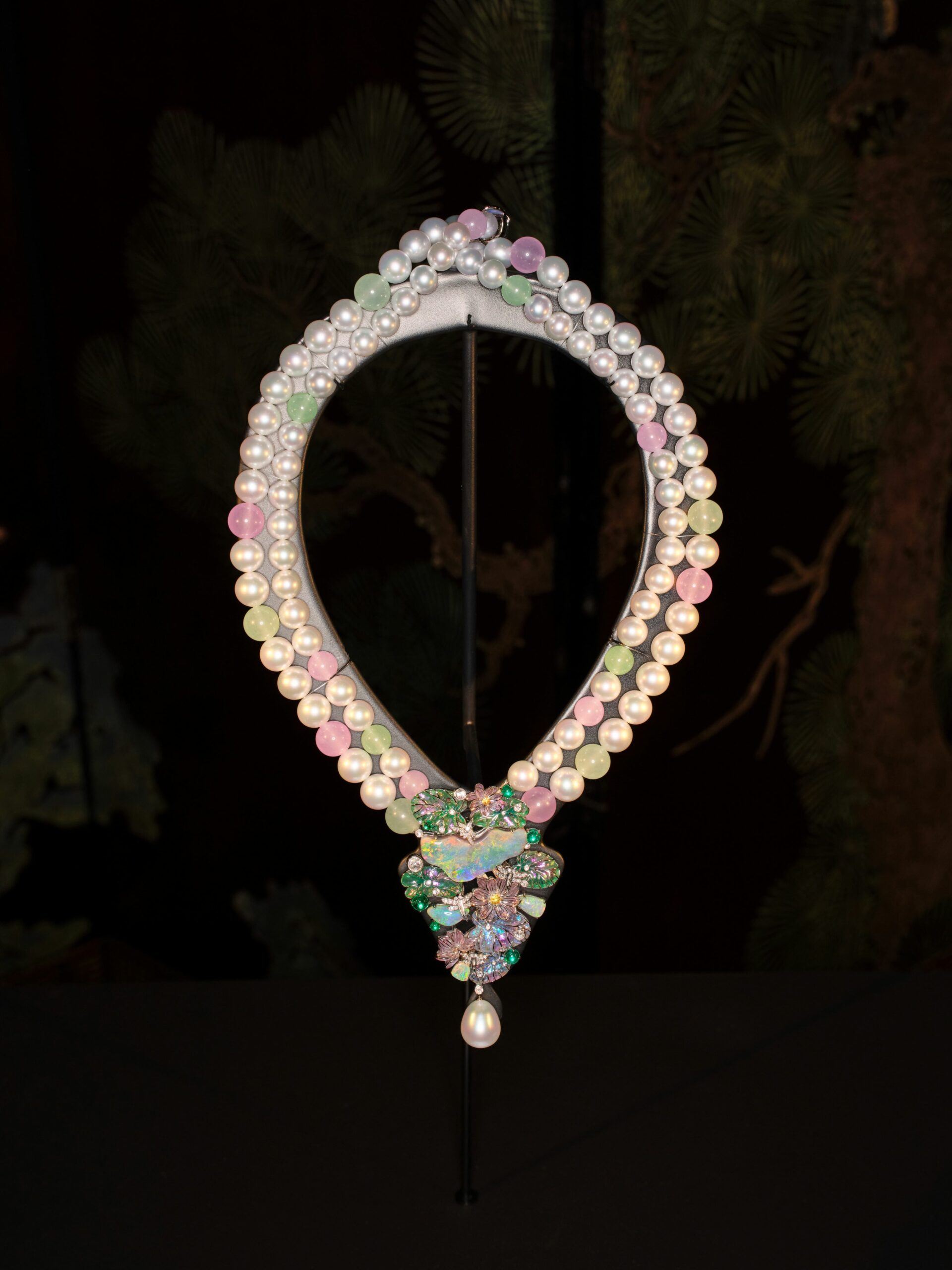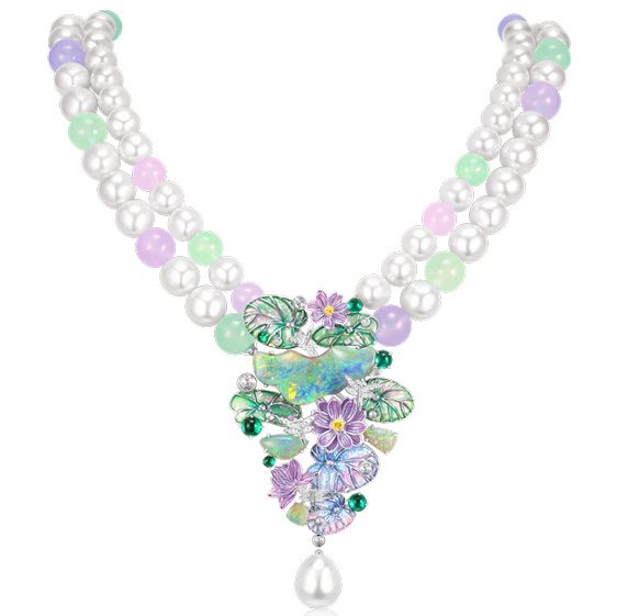 Des nymphéas en émail plique-à-jour se déploient en dégradés doux, rappelant la lumière de l’aube. L’opale ancre la composition -mystérieuse, lumineuse, vivante- entourée de saphirs, d’émeraudes et de diamants. Un chapelet de perles et de pierres précieuses serpente délicatement autour du cou, où l’Orient rencontre l’Occident en une harmonie silencieuse.