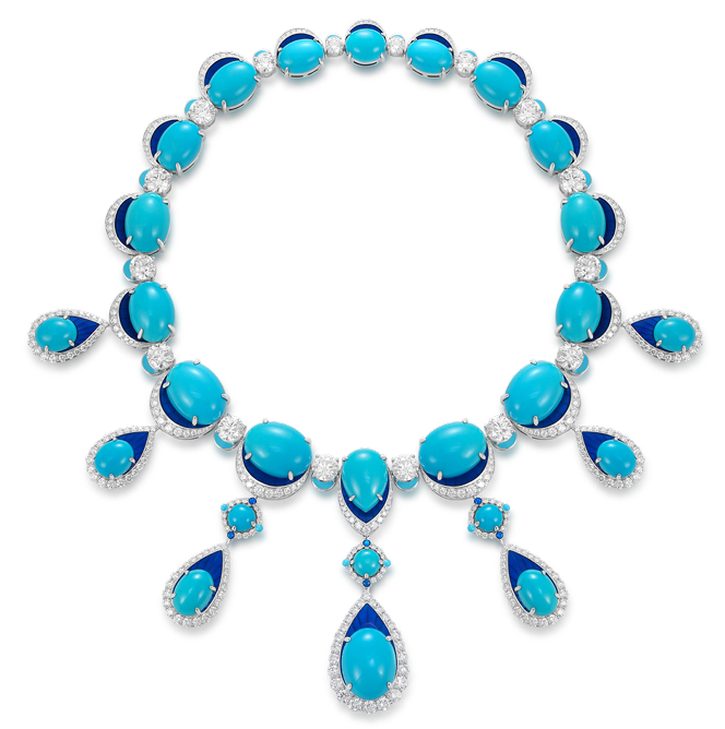 Pierres principales : 26 Turquoises, 208,77 carats – Pierres secondaires : 16 Diamants, 22,14 carats | 416 Diamants, 14,49 carats – Serti en or blanc 18 carats