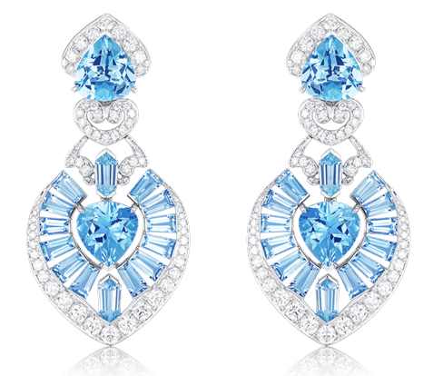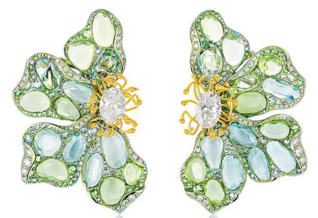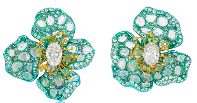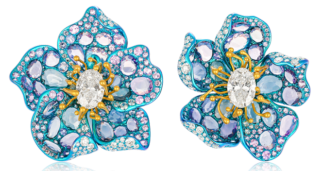 Pierres principales : Une paire de Diamants taille ovale, 4,02 carats – Pierres secondaires : 29 Saphirs multicolores taille rose, 22,37 carats – 179 Tsavorites d’accent, 3,23 carats | 109 Aigues-marines d’accent, 2,41 carats – 255 Diamants taille brillant rond, 2,08 carats – Serti en titane et or blanc 18 carats