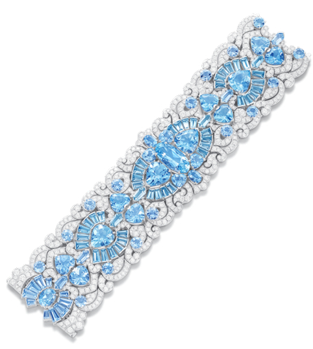 Pierres principales : 20 Aigues-marines, 48,26 carats – Pierres secondaires : 74 Aigues-marines, 27,53 carats | 470 Diamants, 13,09 carats – Serti en or blanc 18 carats