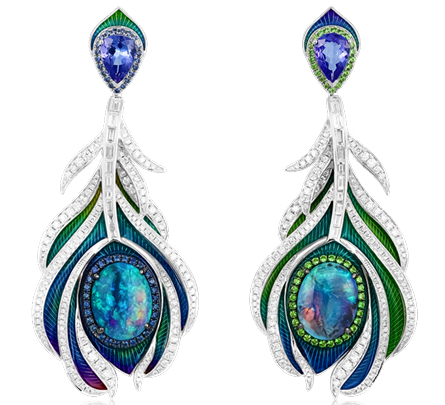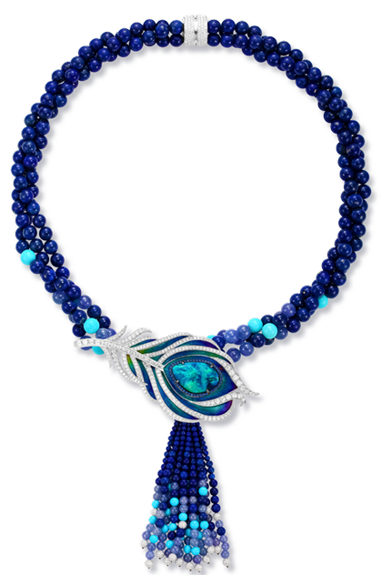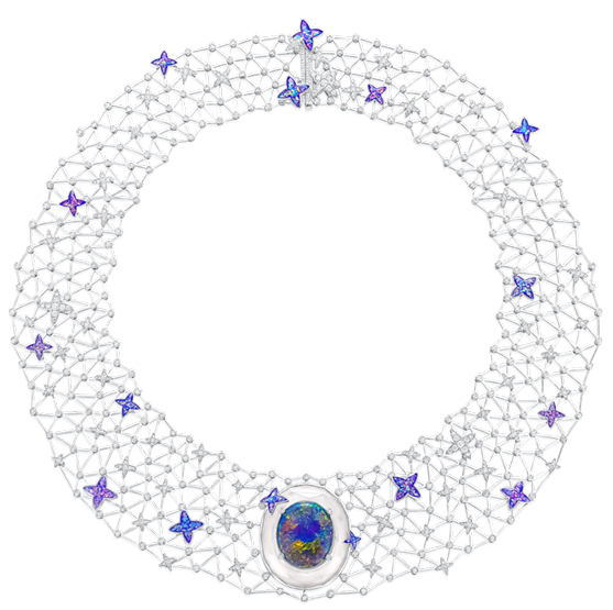 Au centre du collier trône une opale noire d’Australie de 11,88 carats, dont les jeux de lumière flamboyants rappellent les reflets chatoyants des plumes de paon. Le corps principal du collier est transformable et peut être porté comme broche ou ornement de cheveux, dévoilant ainsi tout l’ingéniosité de sa conception.