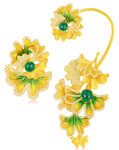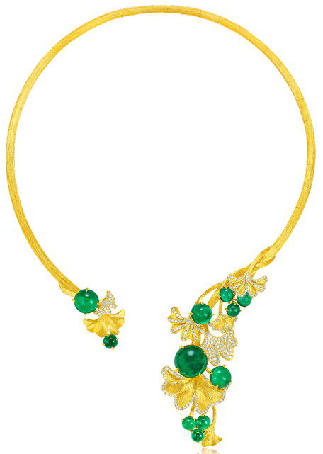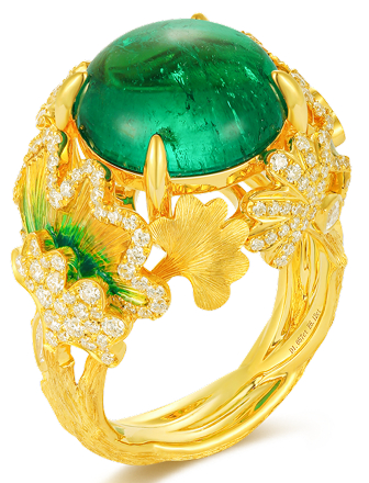 Au centre, un rare cabochon d’émeraude colombienne de 12,17 carats, sans inclusions d’huile, d’un vert profond et d’une transparence éclatante. Le motif du ginkgo est rehaussé par la gravure à flux veiné de Serendipity, qui dessine avec finesse les nervures délicates sur le métal.