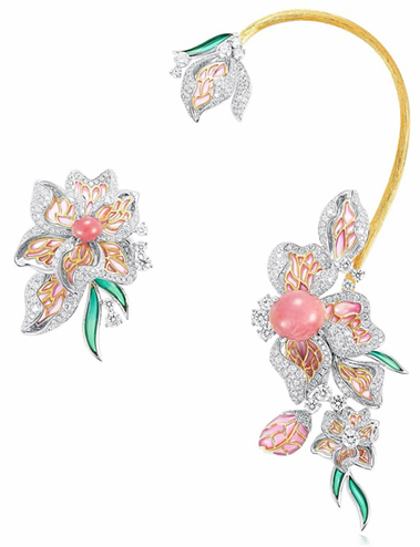 Inspirée par le souvenir d’enfance de Christine, cette pièce reflète la douceur chaleureuse des journées d’été et des couronnes de fleurs tressées sous les arbres. Cette parure -collier, bracelet et boucles d’oreilles asymétriques- met en scène de rares perles de conque aux tons rose-orangés et motifs enflammés, évoquant les iris en doux épanouissement. Les pétales en émail plique-à-jour et les diamants pavés scintillent d’une élégance discrète.